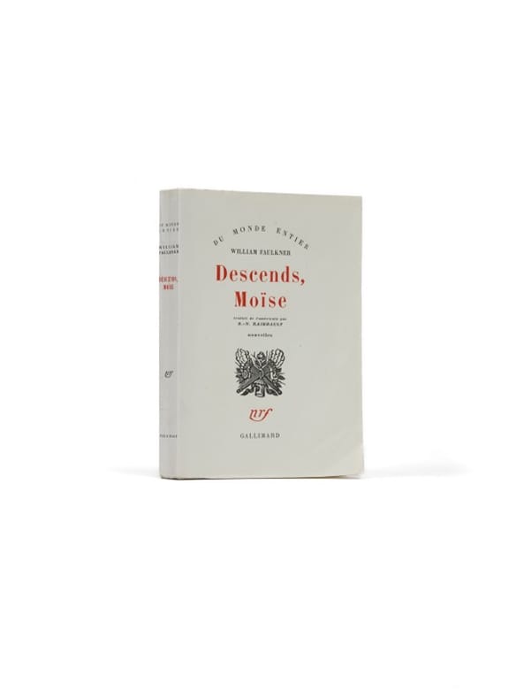 Descends, Moïse est constitué de sept nouvelles formant un court roman et couvrant plus d'un siècle de la famille McCaslin. Le titre fait référence à un standard du negro-spirituals Go down Moses ; Faulkner établissant là un lien entre l'esclavage des Juifs d'Egypte et celui enduré par les Afro-américains. Obsessionnels chez l'auteur, les thèmes de la fatalité, de l'inceste et du racisme sont ici traités avec dérision et ironie, proclamant l'unité de la nature au travers d'une initiation à l'espace sauvage que constitue la forêt. Bel exemplaire.