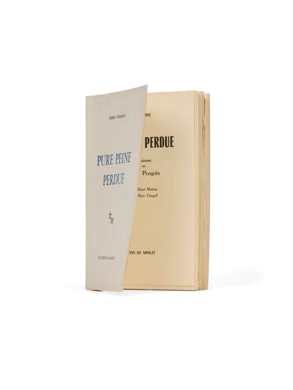 Tirage de tête, ill. par Chagall et Matisse Paris, Les Éditions de Minuit, (10 février) 1955. 1 vol. (125 x 190 mm) de 104 p., [1] et 1 f. Broché, non coupé. Édition originale. Illustrée de 3 dessins de Chagall (dont un en double page) et 1 portrait par Matisse en frontispice. Un des 45 premiers exemplaires sur alfa (n° 17).