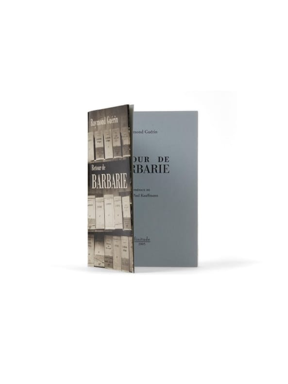Journal de retour et d'insurrection morale : libéré du stalag en décembre 1943 après plus de trois ans de captivité, Raymond Guérin regagne Paris et constate une vie littéraire « comme si de rien n'était ». Guidé par Jean Paulhan et Gaston Gallimard, il revoit Camus, Sartre, Queneau, Chardonne, son compagnon de détention Henri Cartier-Bresson. À Henri Calet, il confie : « Je me fais l'effet d'un revenant, d'un fantôme. Je n'ai plus ma place dans ce monde étouffant et fascisé. » Rentré dans le Sud-Ouest, il note l'ivresse de la Libération, puis la désillusion devant certaines scènes de l'épuration qu'il observe, qu'il juge veules, et clôt ce carnet sur une lucidité sans apprêts : « Il n'y a que cela de vrai dans la vie : les fantoches. Tout le reste est de la foutaise. L'art y compris. [...] Le plus beau théâtre du monde [...] c'est dans le métro qu'on le trouve. Mais c'est à croire que les habitants d'une ville comme Paris ne savent ni écouter ni regarder. » Texte central pour mesurer la ligne de crête de Guérin, Retour de Barbarie est aussi une pièce biographique de premier ordre : le livre raccorde la période des stalags au dernier versant de l'oeuvre (mort prématurée en 1955), et donne la clef d'un positionnement d'écrivain peu conciliant avec son temps, remis au goût du jour grâce aux travaux de Jean-Paul Kauffmann et de l'éditeur bordelais Finitude, qui remit ce texte en circulation et contribua à la redécouverte du « météore noir » des lettres françaises.