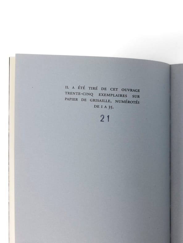 Tirage de tête sur papier de couleurs Bordeaux, Finitude, (juillet) 2005. 1 vol. (120 x 170 mm) de 142 p. et [1] f. Broché, sous couverture illustrée. Édition originale. Préface de Jean-Paul Kauffmann. Un des 35 premiers exemplaires sur papier grisaille (n° 21).