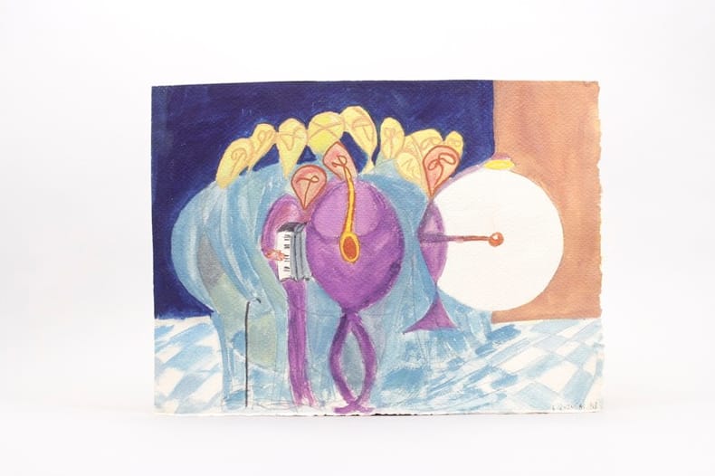 Grande gouache, signé et datée S.l., 1948. Gouache et mine de plomb sur 1 f. de papier Arches (375 x 275 mm). Le sujet représente une scène d'orchestre : grosse caisse, saxophone et accordéon, dans un style très géométrique. Le dessin est signé en bas à droite «R. Queneau».