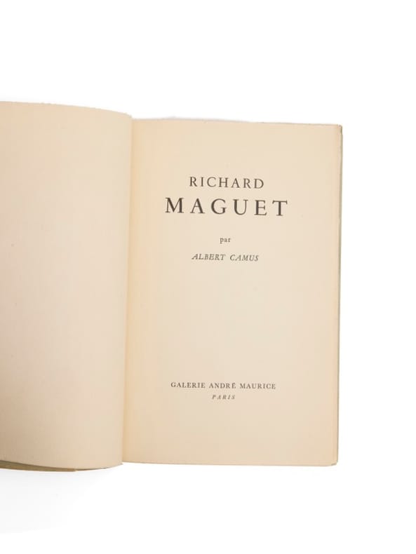 Galerie André Maurice, Paris, 1949. Plaquette brochée, couverture rempliée, 227 X 145 mm, 14 p. Edition originale tirée à 300 exemplaires sur vélin du Marais, celui-ci non justifié. Texte inédit d'Albert Camus écrit à l'occasion de l'exposition rétrospective de Richard Maguet, mort pour la France en 1940. Reproduction en noir et blanc de l'artiste sur feuillet volant. Envoi autographe signé de Denise Maguet, l'épouse du peintre. Bords supérieur et latéral du second plat légèrement insolés, sinon bon exemplaire.