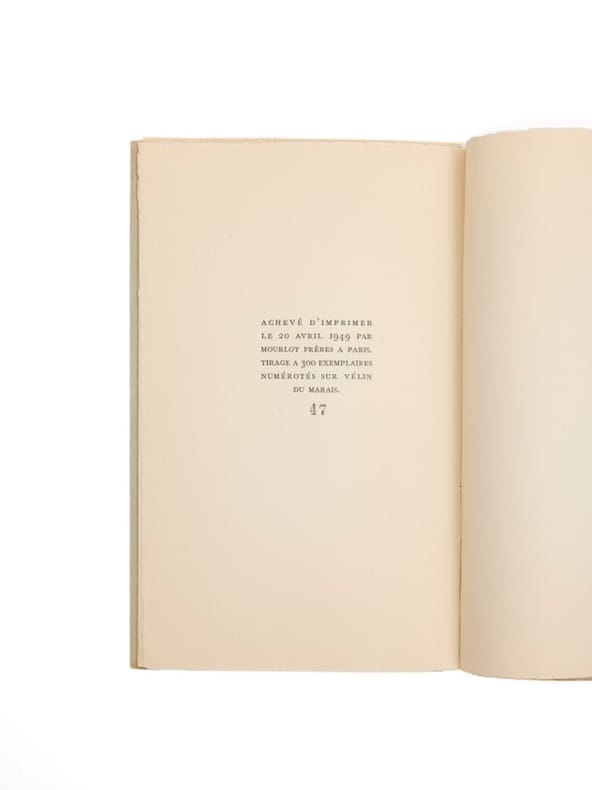 Paris, Galerie André Maurice, (20 avril) 1949. 1 vol. (145 x 225 mm) de 1, [6] et 1 f. Broché. Édition originale. Un des 300 premiers exemplaires sur vélin Marais (n° 47), bien complet de la planche hors texte.