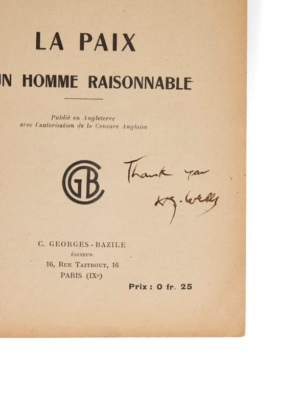 Le pamphlet pacifiste de Wells, signé par l'auteur à son éditeur français Paris, C. Georges-Bazile, (décembre) 1917. 1 vol. (130 x 220 mm) de 8 p. Broché. Édition originale de la traduction française et première publication en volume. Envoi signé : « Thank you. H.G. Wells » à l'attention de l'éditeur du texte, Cécil Georges-Bazile.