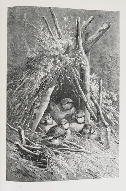 Peintre de genre, Hector Giacomelli (1822-1904) se spécialisa dans la peinture d'oiseaux, multipliant les illustrations d'ouvrages d'histoire naturelle et réalisant gouaches, aquarelles et tableaux sur ce thème, très prisé à la fin du XIXe siècle. Il travaille à plusieurs reprises avec Gustave Doré pour lequel il compose des ornements. Il collabore également au Monde illustré, Le Magasin pittoresque et à L'Illustration. De nombreux bibliophiles lui confieront des exemplaires à enluminer. Il illustrera Michelet, Theuriet Coppée et Musset, Giacomelli fut en outre un collectionnuer averti. Beraldi vante sa collection d'estampes du XIXe siècle. Il fut à ce titre l'un des organisateurs de l'exposition universelle de Paris de 1889 pour la partie estampes. Bel exemplaire.