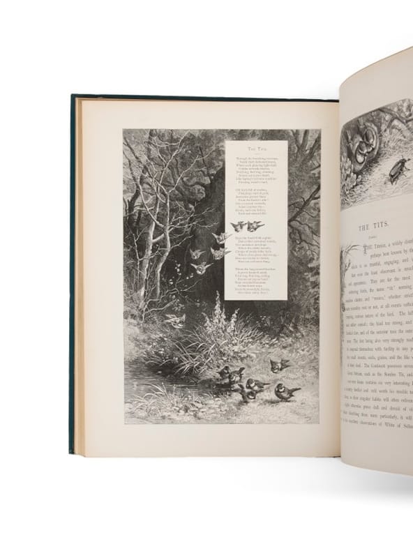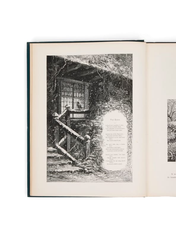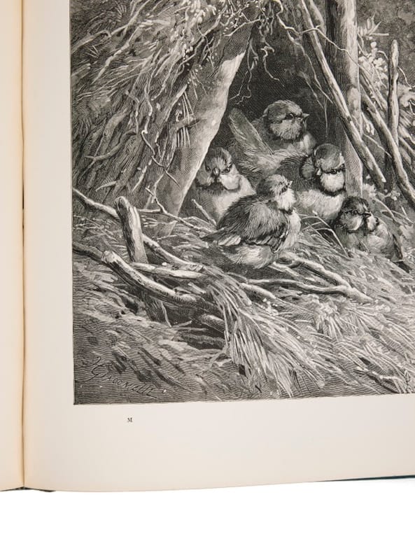 Peintre de genre, Hector Giacomelli (1822-1904) se spécialisa dans la peinture d'oiseaux, multipliant les illustrations d'ouvrages d'histoire naturelle et réalisant gouaches, aquarelles et tableaux sur ce thème, très prisé à la fin du XIXe siècle. Il travaille à plusieurs reprises avec Gustave Doré pour lequel il compose des ornements. Il collabore également au Monde illustré, Le Magasin pittoresque et à L'Illustration. De nombreux bibliophiles lui confieront des exemplaires à enluminer. Il illustrera Michelet, Theuriet Coppée et Musset, Giacomelli fut en outre un collectionnuer averti. Beraldi vante sa collection d'estampes du XIXe siècle. Il fut à ce titre l'un des organisateurs de l'exposition universelle de Paris de 1889 pour la partie estampes. Bel exemplaire, sous un cartonnage éditeur bleu-vert, après celui (rouge) publié en 1882. L'adresse de l'éditeur est alors celle de Cassell, Petter, Galpin & Co, qui devient Cassell & Co. à partir de 1888.
