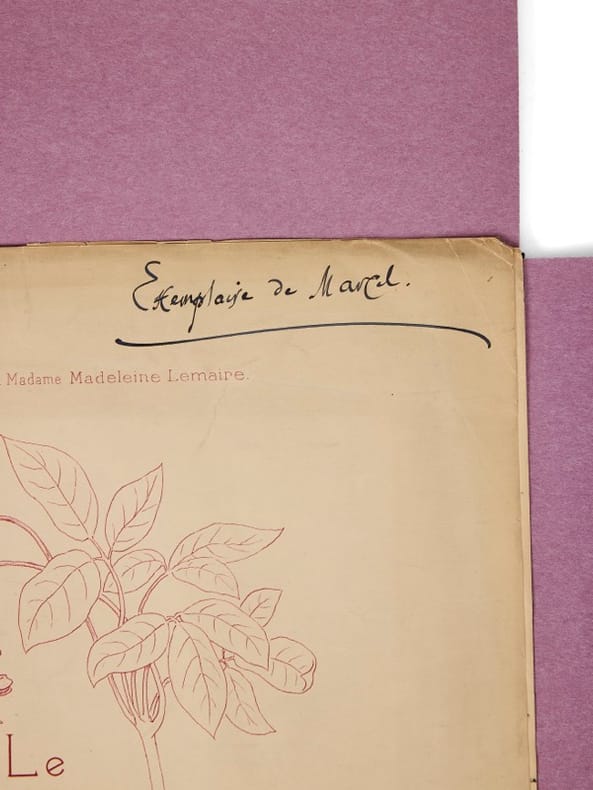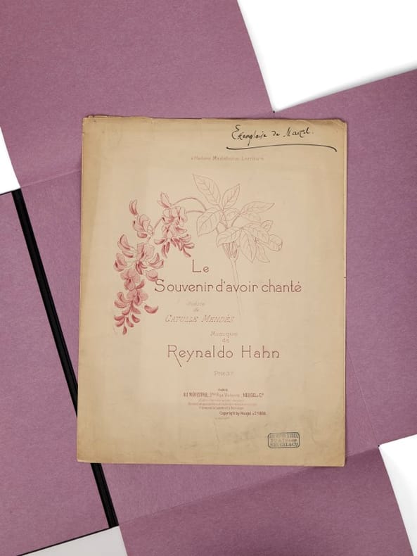 Exemplaire Marcel Proust, offert par Reynaldo Hahn Paris, Heugel, «Au ménestrel», 1898. Partition musicale sur 1 feuillet et un bi-feuillet (270 x 350 mm), dans un emboîtage à rabats de Julie Nadot. Partition musicale sur une poésie de Catulle Mendès. Envoi signé de Reynaldo Hahn : « Exemplaire de Marcel », sur la page de titre.