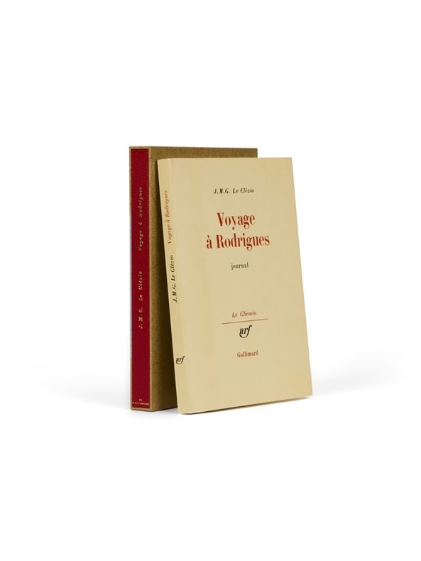 Inspiré par la vie de son grand-père, Léon, et se nourrissant de mythes tant bibliques que littéraires, ce journal rédigé à la première personne fait suite au Chercheur d'or. Issu d'une famille bretonne émigrée sur l'île Maurice au XVIIIe siècle, l'écrivain y retraçait la quête d'un trésor enfoui dans l'île de Rodrigues, au nord-est de Maurice. Un an plus tard, c'est J. M. G. Le Clézio qui livre le récit de sa propre enquête, sur les traces de son grand-père et, partant, des lieux où pourrait se nicher le fameux butin sur ce bout de terre de l'océan Indien. Autrefois déserte, Rodrigues s'est peuplée au fil des ambitions, des espoirs et des rêves de marins bretons, d'esclaves africains, de marchands indiens et négociants chinois... Tous, à leur façon, sont les descendants de chercheurs d'or, ou de quelque chose d'autre : « Il y a le vide du ciel, l'appel de la mer, les oiseaux, les lames des vacoas, cette ivresse de la pierre brûlée, de la mer et du vent qui forment Rodrigues. » L'écrivain a inauguré une plaque en avril 2018 : dans le marbre, il y a fait graver cet extrait du Voyage à Rodrigues : « Il y a un hors du temps, ici, à Rodrigues, qui effraie et tente à la fois, et il me semble que c'est bien le seul lieu du monde où je puisse penser à mon grand-père comme à quelqu'un de vivant. Visibles encore, comme s'ils dataient de la veille, les coups de pioche qu'il a donnés sur la paroi du ravin, au fond du cul-de-sac, à droite et à gauche. » De tous les auteurs strictement contemporains de la fin du XXe siècle, Le Clézio était, avec huit titres, la plupart dédicacés, le plus représenté dans la bibliothèque de François Mitterrand. Bel exemplaire.