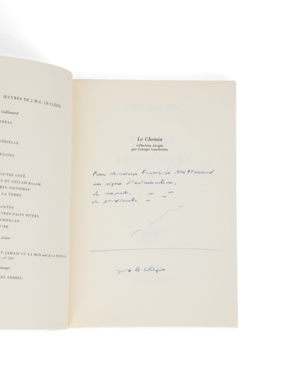 Exemplaire François Mitterrand, avec dessin et envoi. Paris, Gallimard, (6 février) 1986. 1 vol. (140 x 205 mm) de 135 et [1] p. Broché, chemise et étui (Devauchelle). Édition originale. Envoi signé : «Pour Monsieur François Mitterrand, en signe d'admiration, de respect, de proximité. J.-M. Le Clézio», enrichi d'un petit dessin.