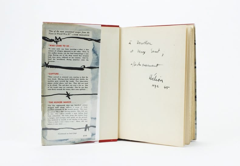 They Shall Not Have Me est le témoignage de Jean Helion sur son expérience de la captivité en Allemagne, depuis la défaite de juin 1940 jusqu'à son évasion en 1942. L'un des peintres les plus en vue dans le domaine de la peinture non figurative, Jean Helion quitte New York en janvier 1940 où il vit avec sa femme, Jean Blair : il souhaite ardemment participer à la guerre, « peut-être parce que j'avais le sentiment de ne pas m'être assez battu pour l'empêcher », expliquera-t-il plus tard. Mais dès le 19 juin, aux confins de l'Eure-et-Loir et du Loir-et-Cher, il est interné dans une caserne désaffectée puis transféré en Poméranie. Il y découvre l'univers des camps de travail forcé, dont il s'évade le 13 février 1942. De retour aux États-Unis, il écrit et publie They Shall Not Have Me (Ils ne m'auront pas) où il dit la faim, la fatigue, la souffrance du corps, mais aussi la honte de l'humiliation et la culpabilité d'en être sorti vivant : « Nous n'étions pas seulement misérables, nous étions ridicules [...]. Nous ne valions pas la peine d'être tués [...] une faille s'est ouverte en moi qui ne se refermera jamais ». Précieux exemplaire du couple Dorothea Tanning et Max Ernst. Le peintre venait alors de rencontrer celle qui allait partager sa vie à New York en décembre 1942, alors qu'il vient d'arriver en Amérique, sur les traces de Peggy Guggenheim - dont Jean Hélion épousera la fille. Comme Jean Hélion, Max Ernst avait été interné entre 1941 et 1942, notamment au camp des Milles près d'Aix-en-Provence. Idéale provenance. Cet exemplaire a été exposé au Musée de l'Armée l'Hôtel national des Invalides dans le cadre de l'exposition Un Exil Combattant, (février-juin 2025).