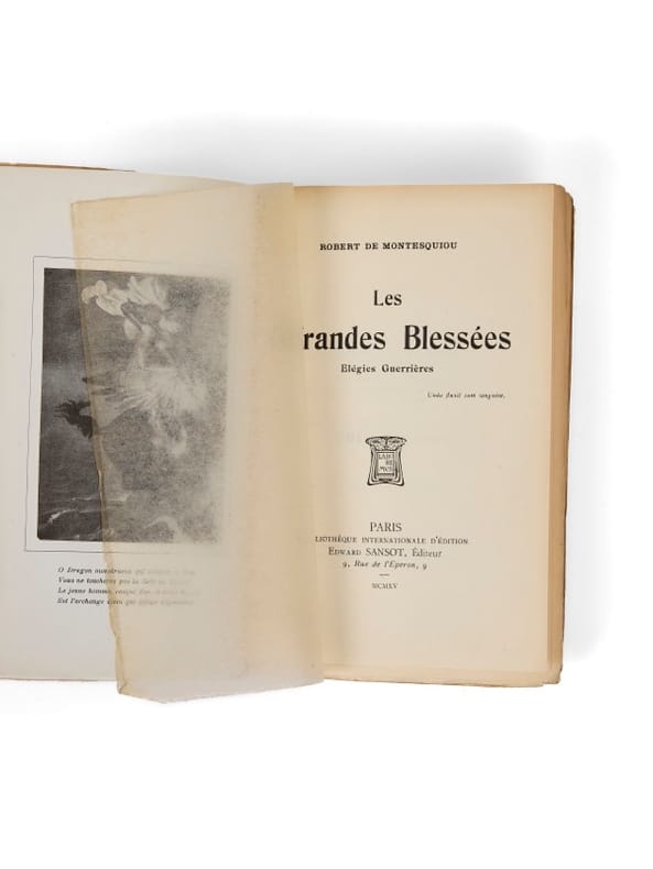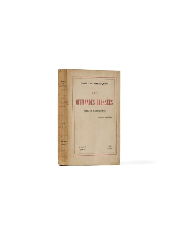 Recueil de 188 poèmes élégiaques inspirés par la guerre, Les Offrandes blessées témoigne de la verve intacte de Montesquiou, qui, retiré en Suisse, verse ici dans une ferveur patriotique d'un autre temps, tout en conservant son style précieux et un certain goût pour l'emphase. Un mois après sa parution, Marcel Proust reçoit l'ouvrage. Il note dans une lettre du 19 juin 1915 à Mme Catusse (Kolb, XIV, n° 71, p. 151) qu'il a bien reçu « un volume Montesquiou : Les Offrandes blessées (188 élégies sur la guerre). Il a dû commencer le premier jour de la mobilisation. Quelle fécondité ! ». Avant de conclure avec ironie, citant l'Horace de Corneille : « Souffrez que je l'admire et ne l'imite pas. » C'était dit ! Quelques jours plus tard, Proust remercie néanmoins Montesquiou de son envoi, évoquant certaines « offrandes » qui l'ont touché et promettant une visite prochaine (Kolb, XIV, n° 80, p. 165-167). Mais Montesquiou, blessé, lui répond sèchement et dresse ce que l'on pourrait lire comme une métaphore de leur relation refroidie à cette époque : « Il y a, entre nous, désormais un mur de glace. Il contient, retient, maintient des fleurs colorées et fraîches ; on les voit, mais sans les atteindre. »