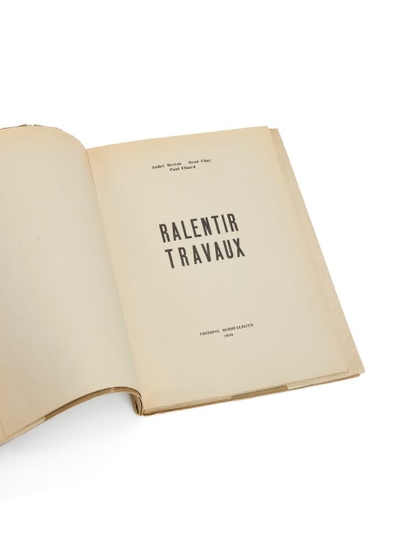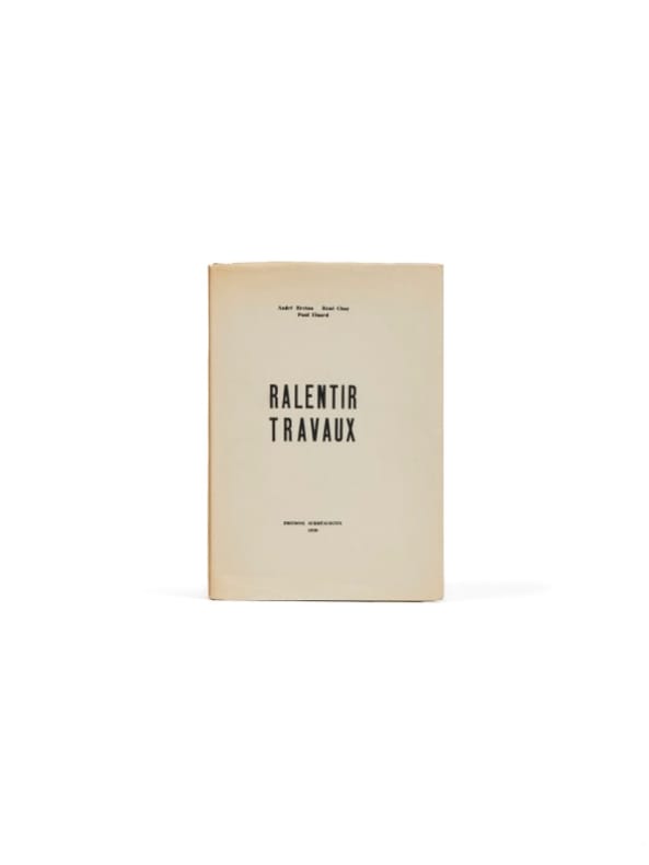 D'Avignon, en avril 1930, Paul Éluard écrit à Gala : « Nous avons fait, Breton, Char et moi un assez long livre de trente très beaux poèmes que l'imprimeur de Char nous fait pour rien à 200 exemplaires ». Le livre sera finalement tiré à 300 exemplaires. Dans son ouvrage, Provisoirement Définitif, José Corti relate l'époque de la création de Ralentir Travaux : « Ce furent des semaines de ferveur poétique. À la fin de ces vacances provençales, l'amitié était scellée et Char se joignit à Breton et Éluard qui rejoignaient Paris, le manuscrit de Ralentir Travaux dans leurs bagages ». Ce recueil à trois mains est l'une des illustrations les plus lumineuses de la volonté de «mise en commun» de la pensée, un des axes majeurs du projet surréaliste. Corti parlera de «mosaïque plutôt que d'amalgame» pour ce collectif où «la partie de chacun (...) est mêlée comme le sable à la chaux». Très rare tirage sur papier de couleurs, en parfaite condition. De la bibliothèque Paul Destribats (Christies, 2019, I - n° 294).