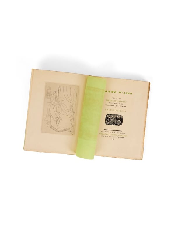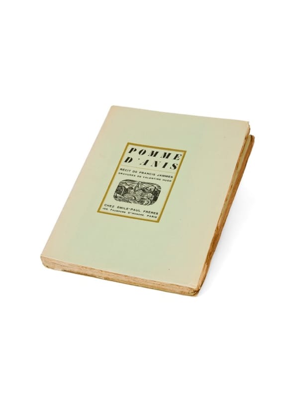 Pomme d'Anis est né d'une rencontre faite à la gare de Mont-de-Marsan, en 1904, lorsque Jammes observe depuis son wagon une jeune fille légèrement infirme - elle boitait - qui, se penchant à la fenêtre, voit arriver un jeune homme atteint de la même infirmité. «Pauvre garçon, aussi malheureux que moi», entend-il de la bouche de la jeune fille. Jammes s'empare alors de cette scène pour cette nouvelle dont il envoya les épreuves à Colette, avec qui une amitié solide s'était nouée depuis l'année précédente : «sa compréhension profonde de la campagne et de tous ceux qui la peuplent - hommes, bêtes et plantes -, sa pitié pour les humbles, son goût des vieilles demeures, des jardins parfumés [...] rien de Francis Jammes qui n'éveillât en Colette une ardente résonance» (in Colette & Francis Jammes, une amitié inattendue). Cette dernière lui envoyant, pour qu'il les jugeât, ses premiers Dialogues de bêtes dont il donnera la préface. Très bel ouvrage, illustré de charmantes gravures de Jean Hugo : celles faites initialement par Valentine, son épouse, furent perdues chez l'éditeur au moment du tirage et Jean Hugo, épousé en 1919, en composa huit nouvelles afin de les remplacer. En dehors des lettres documentant l'affaire, l'exemplaire de Francis Jammes détient cet aveu sans équivoque signé du couple : «Avec ma fidèle amitié, cette imposture, Valentine Hugo, Jean Hugo». Monod, I , 6353 ; Talvart, X, 70 ; Carteret, V, 111 : Anne de Margerie, Valentine Hugo.