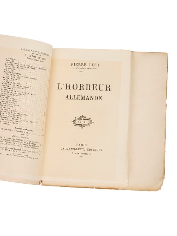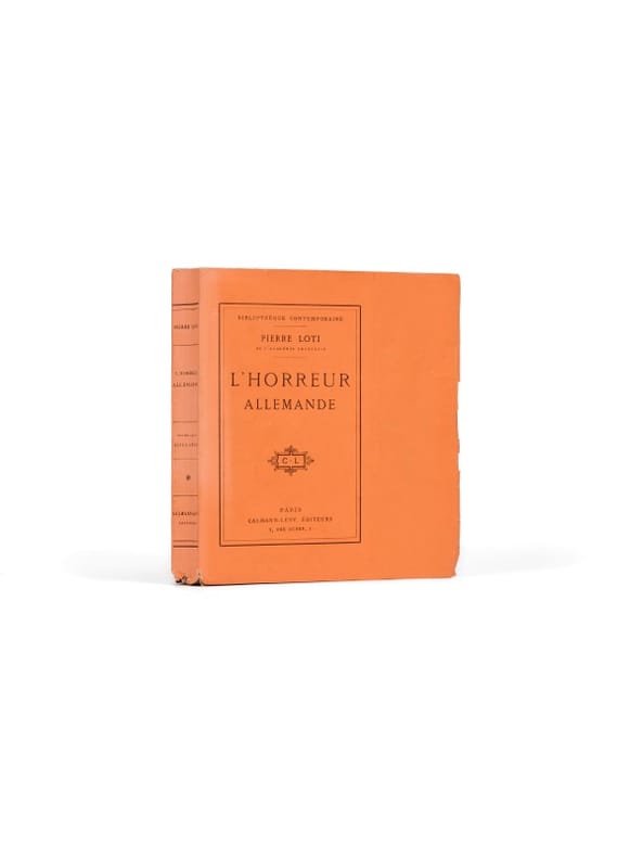 Lorsque éclate la guerre pendant l'été 1914, Loti décide de reprendre du service et demande à être mobilisé. Affecté comme agent de liaison auprès du général Gallieni, gouverneur militaire de Paris, il joue alors les émissaires secrets entre la France et la Turquie, alliés des Empires. Il sera cité en 1918 pour son action militaire, poursuivant son engagement en faveur de l'Empire ottoman prêt à être démembré par les puissances occidentales vainqueurs. Peine perdue : la participation des Ottomans aux côtés des Allemands ne leur vaudra aucune indulgence lors des traités de paix signés en 1919. Le désenchantement gagne Loti ; il ne le quittera plus. Bel état de la fragile couverture orange, dos légèrement insolé.
