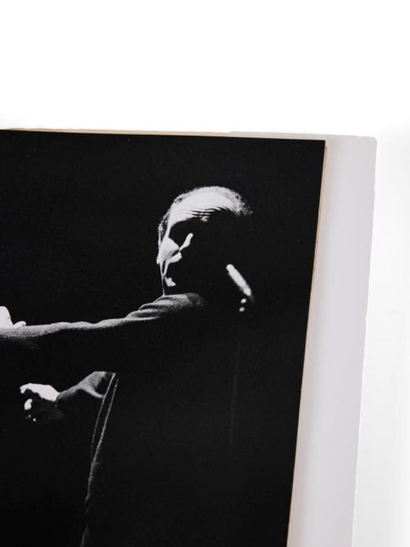 Cet album, composé à quelques unités (vraisemblablement une quinzaine), sera distribué aux proches du chanteur et du photographe. Chacun est numéroté et signé, et nous en connaissons les n° 2, 5,11 et 12. Le programme officiel du théâtre de l'ABC, Léo Ferré - Récital 1963, contiendra bien des clichés pris dans le petit fort de Saint-Coulomb, mais aucune photo de cette exceptionnelle série n'y figurent. Il n'existe aucune autre publication de ce petit reportage confidentiel. Célèbre music-hall sis 11 boulevard Poissonnière dans le IIe arrondissement de Paris, L'ABC fut inauguré en 1935, à la place de l'ancien théâtre Plaza, transformé en music-hall par Mitty Goldin, qui choisit judicieusement de le rebaptiser ainsi «pour être en tête, par ordre alphabétique, des programmes parisiens». En 1962 Léo Ferré est le premier auteur-compositeur à être édité dans la collection «Poètes d'aujourd'hui», chez Pierre Seghers. Il travaille tout l'été à ce récital, prévu de longue date pour l'hiver 1962 et s'y produit de décembre à janvier 1963, peu avant que la salle ne ferme en 1964, transformée en un cinéma, lequel est inauguré en mai 1965. Il cessera son activité en décembre 1981. Un 33 tour, suite à ces concerts, paraîtra en 1963, Alhambra-ABC, rapidement retiré de la vente : la chanson «Mon Général» déplaît évidemment aux autorités et l'album est censuré. Il contenait huit titres («Chanson mécanisée», «Le vent», «T'as payé», «Les Temps difficiles», «Mon Général », «Stances», «Nous les filles» et «Regardez-les»), dont seuls quatre ont été enregistrés sur place (les titres 3-4-5 et 6). Cinéaste de formation, Jean-Pierre Sudre développa une oeuvre de photographe d'art, très en marge des tendances de son époque et d'une rare poésie. Lors de sa première rencontre avec Léo Ferré il réalise une série de photos du chanteur dans sa propriété de Saint-Coulomb en Ille-et-Vilaine, les clichés sont utilisés pour les visuels de l'album La Langue française, qui paraît à la rentrée de septembre 1962. Pour Sudre c'est aussi l'année de sa première exposition parisienne, sous l'égide de Brassaï qui en préface le catalogue. À l'automne Ferré lui fait à nouveau appel pour couvrir les répétitions à l'ABC. Il réalise alors cette série de clichés pris sur le vif des répétitions. Tirages originaux noir et blanc sur papier argentique.