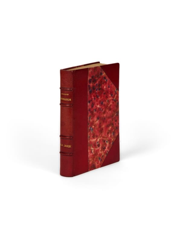 Lancé par le succès considérable de son tout premier roman, Sous le soleil de Satan paru en 1926, Georges Bernanos se jeta sans délais dans l’écriture fiévreuse de L’Imposture, qui manque de peu le prix Goncourt. Sa suite, troisième roman de l’auteur, s’intitule La Joie, qui n’est pas celle de M. de Clergerie, un historien médiocre et obsédé par ses ambitions académiques, qui vit dans son château artésien. Dans ce roman, dira Malraux, Bernanos « a écrit les plus belles scènes de la fiction moderne, par la profondeur et la puissance » ; et, pour Mauriac, « le pouvoir de cette œuvre fulgurante tient dans sa poigne rude qui nous maintient dans cet univers de la chute et de la Rédemption, qui est le nôtre à tous, croyants et incroyants. Car il n’est pas nécessaire d’avoir la foi pour s’y reconnaître […] ». Ils seront nombreux dans ce cas et La Joie sera couronné par le prix Femina. Bon exemplaire, établi dans une reliure de demi-maroquin rouge strictement d’époque, puisqu’elle est l’œuvre d’Auguste Bernasconi, relieur d’origine suisse de la première moitié du XXe siècle. Etabli à Paris, rue de Seine, à partir de 1906, il officia jusque dans les années 1930. Il s’associa ensuite avec le relieur Goix, avenue de Lowendal, jusqu’en 1948.