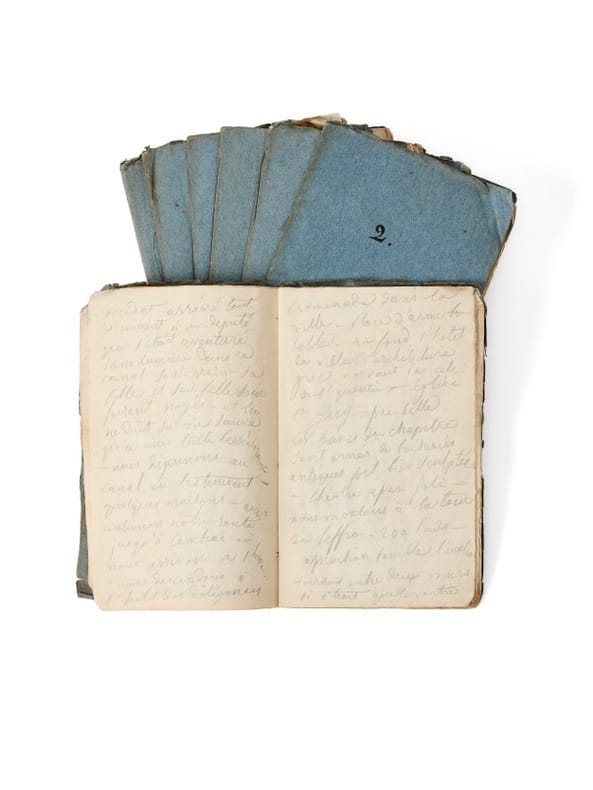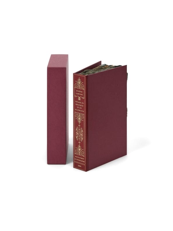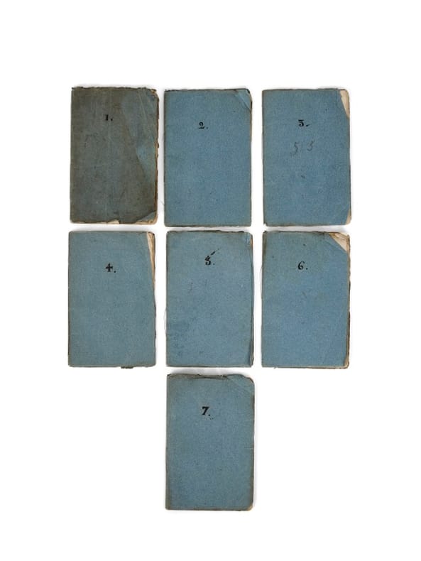 Le journal inédit du voyage d'Eugène Labiche 25 juillet au 12 septembre 1835. 7 carnets (162 x 100 mm) de 6 et 24 f et 1 et 34 f, rédigés à la mine de plomb, Brochés, sous couverture bleue, chemise et étui (Elbel Libro). Manuscrit autographe inédit, sous forme d'un journal de bord, dans lequel Eugène Labiche retrace son voyage en Belgique et en Allemagne entrepris entre le 25 juillet et le 12 septembre 1835.