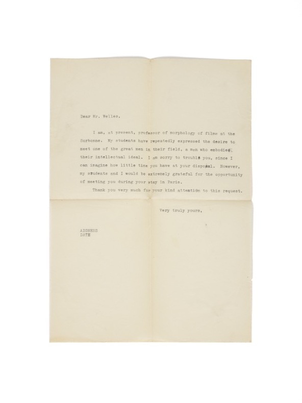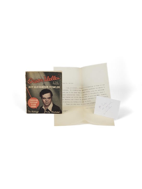 Joints : - L'édition originale de la première biographie consacrée à Orson Welles, par Roy Alexander Fowler et publiée à Londres par Pendulum, quelques semaines après la sortie de Citizen Kane à Paris, en juillet 1946, avec une reproduction photographique tirée du film. - Une lettre dactylographiée, adressée à Orson Welles par un professeur de la Sorbonne qui sollicite le réalisateur pour une rencontre avec ses étudiants, à l'occasion du passage du cinéaste à Paris, en 1947. Welles vient de terminer le tournage de Macbeth aux États-Unis et, suivant la méthode rodée avec La Splendeur des Amberson, il choisit de monter le film à l'étranger - en l'occurrence à Paris. L'escapade est aussi fiscale et politique: Welles fuit l'IRS américain et les chasseurs de sorcières du maccarthysme déterminés à lui faire payer son soutien appuyé aux causes de gauche. Il restera vingt ans sans revoir les États-Unis.