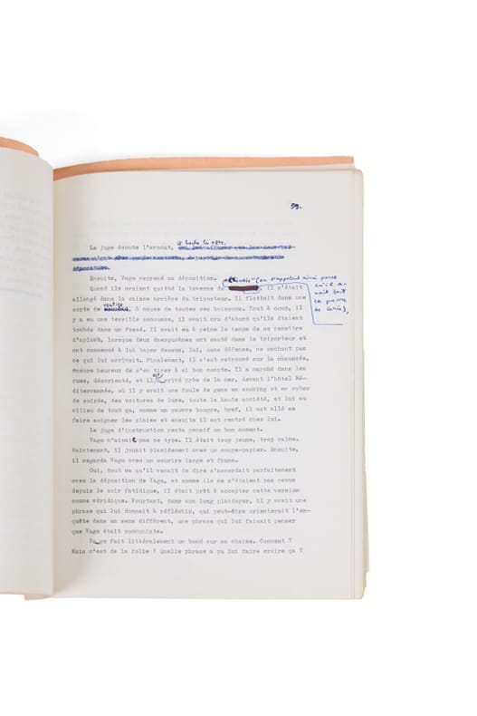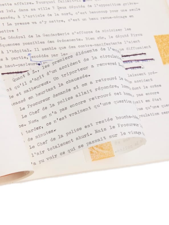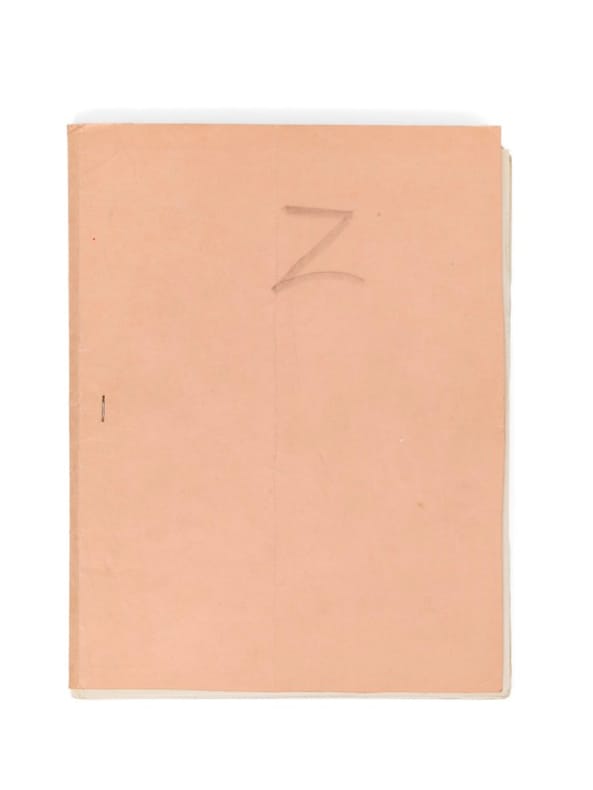 Dactylogramme original de Z : exemplaire du scénariste, Jorge Semprun. Ivry-la-Bataille et Paris, 1967. 1 vol. (205 x 265 mm) de [1] et 91 f., couverture rose titrée « Z » par Semprun. Dactylogramme original de l'adaptation du roman pour le film de Costa-Gavras. Exemplaire Jorge Semprún. Il est corrigé par l’auteur, avec une centaine de notes, repentirs, ajouts et variantes qui parsèment le document. Plusieurs paperolles ont été contrecollées quand les corrections sont plus importantes.
