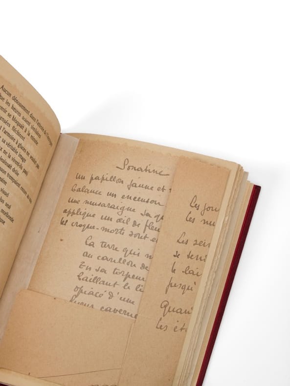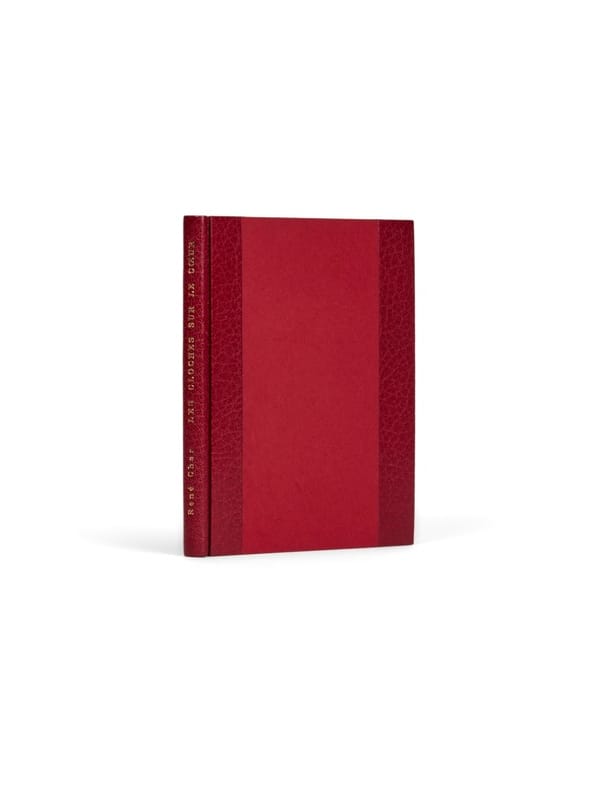 Exemplaire Armel Ferrand, avec poèmes autographes Paris, Le Rouge et le Noir, (20 février) 1928. 1 vol. (125 x 165 mm) de 63 p. et [4] f. Demi-bradel rouge à bandes, titre doré en long, tête dorée, étui bordé (reliure signée de Clara Gevaert - Claude Ribal). Édition originale. Illustrée de trois compositions à pleine page de Louis Serrière-Renoux. Un des 150 exemplaires sur papier vergé, seul tirage avec trois exemplaires sur Lafuma (n° 89). Envoi signé: «Pour mon ami Armel Ferrand, ces cloches de quatre saisons (sentimentales, sensuelles, lasses et sanguinaires) en sympathie toute amicale de René E. Char. Nîmes, 30 juillet 28». Montée en tête, une lettre autographe signée adressée à Armel Ferrand, envoyée avec l'exemplaire (1 page en 1 f. plié 100 x 135 mm) ainsi que deux poèmes manuscrits, 2 p. en 1 f. (135 x 195 mm) et 1 p. en 1 f. (160 x 160 mm). Il s'agit des poèmes «Sonatine», daté de novembre 1927, et celui des «Parallèles du coeur», sans doute. Ils sont de premiers jets, sur papier quadrillé ; les deux manuscrits sont placés en regard des poèmes imprimés.