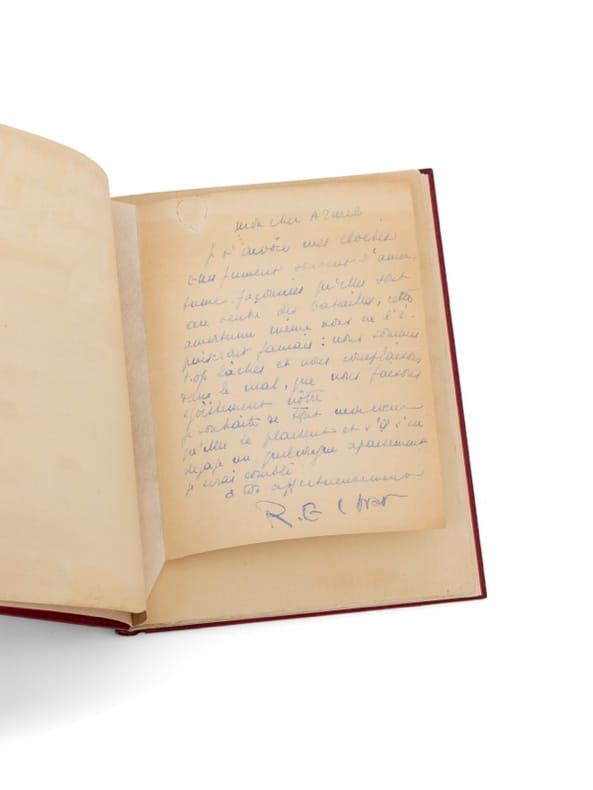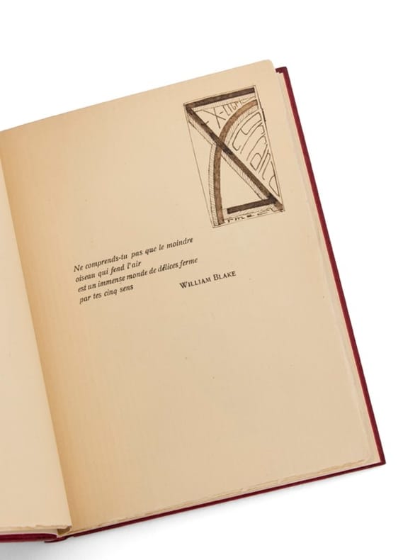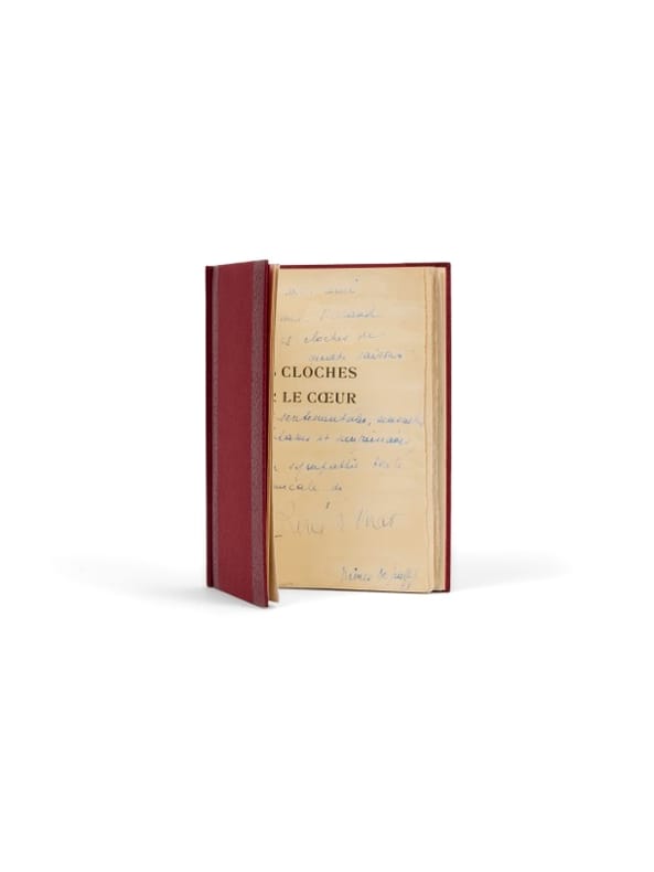 Imprimé à 153 exemplaires seulement, ce recueil est d'une grande rareté : René Char en détruira la quasi-totalité, désavouant cette production de jeunesse : « son titre me devint rapidement haïssable ; mais à vrai dire, derrière ce titre, c'étaient des poèmes dont je n'étais guère fier ». Le sort de ces trente-huit poèmes, écrits entre 1925 et 1927, poème de jeunesse composés entre sa dix-huitième et sa vingtième année est singulier et rude : Char ne l'évoquera plus dans sa bibliographie qu'il fera par la suite ensuite débuter avec Arsenal ! Les manuscrits de René Char de cette époque sont rarissimes et il n'existe pas de manuscrits de ce recueil - le premier de René Char - et les quelques manuscrits connus des poèmes ont été dispersés au gré des volumes. C'est à Nîmes, où René Char effectue, depuis 1927 et pour dix-huit mois, son service militaire dans le régiment d'artillerie, qu'il s'attelle à la composition du recueil. Il termine sa mise en forme à l'automne 1927 ; l'édition, à compte d'auteur, est assurée par une petite maison d'édition parisienne, qui publie une revue littéraire, Le Rouge et le Noir à laquelle Char a collaboré régulièrement entre 1925 et 1927 - l'un des poèmes des Cloches « Ravage de la Lune » y a d'ailleurs déjà paru et Char dédiera le poème « Sonatine », l'un des derniers composés (ici avec son manuscrit) à son directeur Henri Lamblin. Les volumes, imprimés sur « les presses d'Albert de Mallortie, maître-imprimeur à Roubaix », lui sont livrés en mai 1928 à Nîmes. L'édition est illustrée de 3 dessins à pleine page de Louis Serrières-Renoux, géomètre et momentanément artilleur à Nîmes, dans le même régiment de Char. Serrières-Renoux sera aussi le créateur de la couverture de l'éphémère revue Méridiens revue fondée par René Char en 1929 et qui ne connaître que 3 numéros. Les exemplaires des Cloches sur le coeur sont significatifs de l'entourage intellectuel du jeune René Char : ceux des poètes qui comme lui participent aux petites revues littéraires de l'époque. Parmi ce premier cercle poétique et amical, Armel Ferrand, qui reçoit son exemplaire avec une lettre d'importance tant elle situe le René Char de cette première époque : « Mon cher Armel, je t'envoie mes Cloches. Elles furent souvent d'amertume façonnées qu'elles sont au ventre des batailles, cette amertume même nous ne l'épuiserons jamais : nous sommes trop lâches et nous complaisons dans le mal que nous faisons égoïstement nôtre. Je souhaite de tout mon coeur qu'elles te plaisent et s'il s'en dégage un quelconque apaisement je serai comblé. À toi affectueusement. R. E. Char. » Char n'en offrira ainsi que quelques exemplaires : Jean Gleizes (Nîmes, mai 1928), Lucien Franchi (Marseille, 1928) ; Maurice Courtois-Suffit (Nîmes, mai 1928) ; Michel Rousselot (non situé, 1928, avec le manuscrit du poème « Pour une vierge », le dernier du recueil), Julien Lanoë (non situé, juin 1928) et André Cayatte (Nîmes, mai 1928) ; une seule dédicace est connue à un poète 'installé', celle à Jules Supervielle (Nîmes, mai 1928). Il offrira, plus tardivement, trois autres exemplaires : à Yves et Jeannette Tanguy (en 1946) ; à Paul Éluard (en 1947) et à Yves Breton (en 1951). Provenance : bibliothèque d'Armel Ferrand (ex-libris dessiné, en regard de la citation de William Blake).