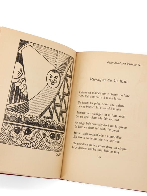 Exemplaire Michel Rousselot, avec poème autographe Paris, Le Rouge et le Noir, (20 février) 1928. 1 vol. (130 x 165 mm) de 63 p. et [4] f. Maroquin taupe, dos lisse, titre doré, tête dorée, couverture et dos conservés, étui bordé (reliure signée de Clara Gevaert, titrage de Claude Ribal). Édition originale. Illustrée de trois compositions à pleine page de Louis Serrière-Renoux. Un des 150 exemplaires sur papier vergé, seul tirage avec trois exemplaires sur Lafuma (n° 61). Envoi signé : « À Michel Rousselot, homme de sac et de corde, d’une main sûre pour qu’il colle à la balle. Son ami, René Char ». Précieux exemplaire enrichi du manuscrit autographe du dernier poème du recueil, « pour une vierge », signé et daté du 10 octobre 1927, soit l'un des derniers composés à l'automne avant la composition définitive.