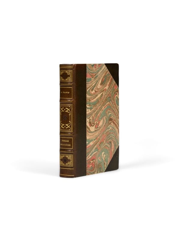 27 vol. in-12 reliure uniforme demi-veau vert, dos lisse orné en long, Calmann-Lévy, Paris, s.d. [ circa 1900-1920 ]. Liste des titres : : Pierre Nozière ; Les Opinions de M. Jérôme Coignard ; Jocaste et le Chat Maigre ; Balthasar ; Le Puits de Sainte Claire ; Le Jardin d'Epicure ; Le Crime de Sylvestre Bonnard ; Thaïs ; Sur la Pierre Blanche ; Les Désirs de Jean Servien ; Le Lys rouge ; Les sept Femmes de Barbe-Bleue ; Le livre de mon ami ; L'étui de nacre ; Crainquebille, Putois, Riquet ; La Rôtisserie de la reine Pédauque ; L'Ile des Pingouins ; Histoire comique ; Les Dieux ont Soif ; Histoire Contemporaine (4 Tomes - Complet : L'Orme du Mail ; Le Mannequin d'Osier ; L'Anneau d'Améthyste ; Monsieur Bergeret à Paris) - La Vie Littéraire (4 Tomes - Complet)