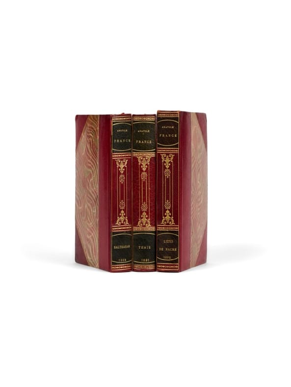 Les deux premiers recueils de nouvelles d'Anatole France et le conte reliés par Visinand. Paris, Calmann Lévy, 1889, 1891 et 1892. 3 vol. (115 x 180 mm) de 293, 315 et 350 p. Bradels demi-chagrin rouge à coins, dos orné, titre doré, date en pied, tête dorée, couvertures conservées (reliure signée de Visinand). Éditions originales. Ensemble des deux premiers recueils de nouvelles de l'auteur et du conte Thaïs. On joint l'édition en fac-similé établie sur le manuscrit Louis Barthou de Thaïs. Tirage limité à 142 exemplaires, numérotés et signés par l'éditeur (n° 124) + un exemplaire de la seconde édition de l'Étui de nacre, Calmann-Lévy, 1922.