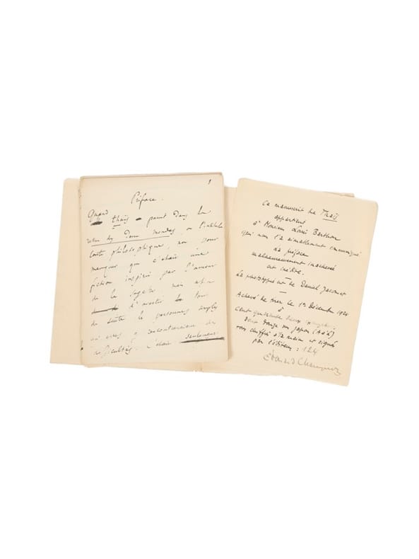 « Que le conte et la nouvelle est de meilleur goût [que le roman] ! Que c'est un moyen délicat de plaire aux gens d'esprit ! [...] La première politesse de l'écrivain, n'est-ce point d'être bref ? La nouvelle suffit à tout. » (Anatole France, La Vie littéraire, t. IV). France ne se défit jamais de ce goût pour les récits courts et commença ainsi sa carrière après quelques recueil de poèmes. Il y voyait là un moyen efficace de transmettre ses idées et sa philosophie des choses Le manuscrit d’un des titres les plus célèbres de France, Thaïs, fut rédigé sur le papier à en tête du Sénat où Anatole France est en poste. La publication en feuilletons dans la Revue des Deux mondes est gérée par Leontine de Caillavet (1er et 15, 1er août 1889) sous le titre définitif de Thaïs. «Le succès fut retentissant et il redoubla d’ampleur, lors de la publication en volume, au mois d’octobre 1890. Brusquement le nom d’Anatole France se répandit dans le grand public : il devint un auteur célèbre et se vit placé sur le même pied que les principaux chefs de file, les Zola, les Maupassant, les Daudet, les Loti, les Bourget qui l’avaient précédé sur la route de la gloire […]». Thaïs connaîtra deux éditions illustrées, l'une par P.-Albert Laurens en 1900 aux éditions Romagnol, l'autre par Rochegrosse en 1909 chez Ferroud. Charmantes reliures uniformes de Visinand pour les deux premiers recueils de nouvelles d'Anatole France et son célèbre Thaïs.