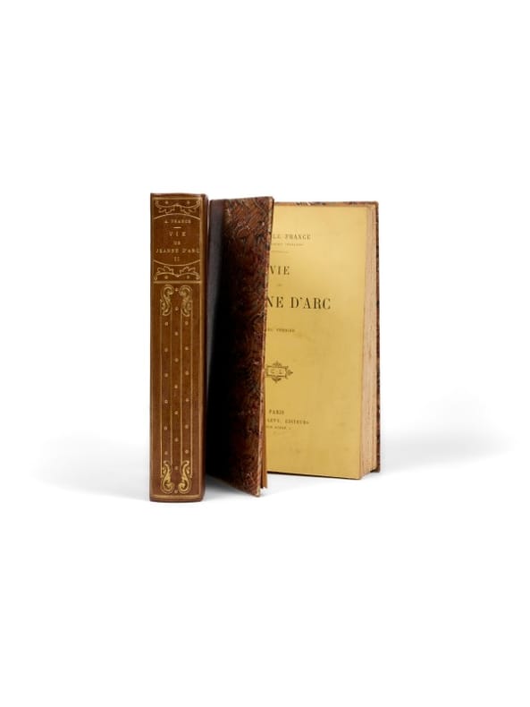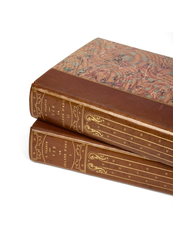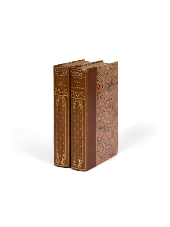 Édition originale du grand livre historique de France sur Jeanne d'Arc Paris, Calmann-Lévy, (août) 1904 et (février) 1908. 2 vol. (150 x 230 mm) de [2] f., LXXXIII-553 et 1 f. ; [2] f., 483 p., [1] et 1 f. Demi-chagrin marron, dos orné, titre doré, tête dorée, filets dorés sur les plats, couvertures conservées. Édition originale.