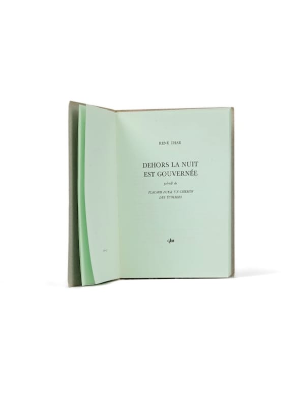 Papier vert de tête et envoi Paris, GLM, (décembre) 1971. 1 vol. (145 x 195 mm) de 75 p., [1] et 1 f. Broché. Nouvelle édition collective, qui reprend la première de 1949. Un des 48 premier exemplaires sur papier vert. Envoi signé : « 'Un instant large tout entier vitre mouvante' R.C. - À Nadine Cail, au poète, avec attachement, son ami. René Char. 1979 ».