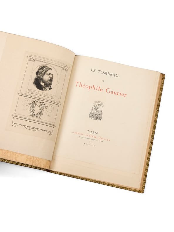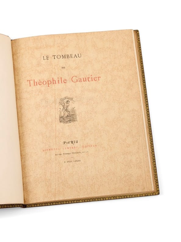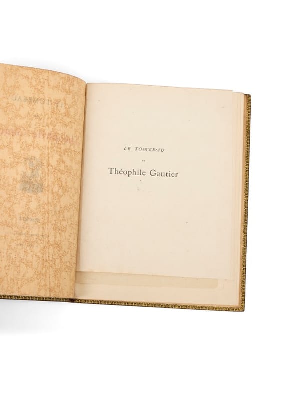 Recueil collectif d'hommages poétiques dédié à Théophile Gautier, figure tutélaire du Parnasse. L'initiative, attribuée à Albert Glatigny, fut concrétisée par l'éditeur Lemerre, qui sollicita dès octobre 1872 ses auteurs en leur demandant « un sonnet au moins, cinquante vers au plus ». Le volume réunit 93 poèmes de 83 contributeurs, parmi lesquels Mallarmé (Toast funèbre), Banville, Cladel, Cros, Dierx, France, Glatigny, Heredia, Hugo, Lacaussade, Lafenestre, Leconte de Lisle, Mendès, Mistral, Ratisbonne, Swinburne ou encore Theuriet. Mallarmé, en particulier, y définit le rôle du poète à travers la figure de Gautier comme « emblème » plus que comme maître au sens classique : « Ô de notre bonheur, toi, le fatal emblème ! » Avec les trois volumes du Parnasse contemporain (1866, 1869, 1876) et Sonnets et eaux-fortes (1867), ce Tombeau constitue l'un des monuments fondateurs du mouvement parnassien et s'inscrit dans la tradition humaniste des recueils funèbres du XVIᵉ siècle. Exemplaire de choix sur papier de chine, admirablement établi à l'époque par Courmont en pleine reliure à riche décor, vraisemblablement pour Alfred Piat. Provenances remarquables : Alfred Piat - avec son ex-libris « princeps » (première version du cul-de-lampe et correction manuscrite au vers « Et l'instruit à vivre et mourir ») ; Cortland-Bishop (ex-libris) ; Sicklès (vente New York, 1947) ; Tileston-Wells, président de l'Alliance française (ex-libris) ; collection privée française.