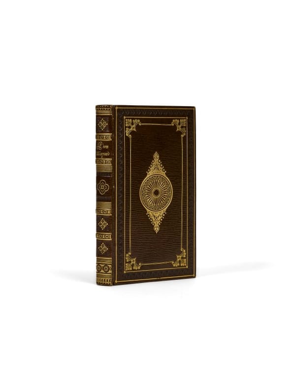 Edition princeps Paris, Louis Janet, 1826. 1 vol. (90 x 160 mm) de 2, [1], 1, [1] f. et 192 p. Maroquin brun à grain long, dos à nerfs orné, titre doré, plats ornés d'un décor à la Du Seuil, grand médaillon doré au centre, contreplats et gardes de percaline, tranches dorées, roulettes sur les coupes. Édition princeps pour trois fabliaux : «Griselidis», «Le Chevalier de la Trappe» et «Sémiramis». Illustrée d'un titre-frontispice et de six grandes figures hors texte, gravées et finement rehaussées à la gouache, dont deux signées par Rouargue.