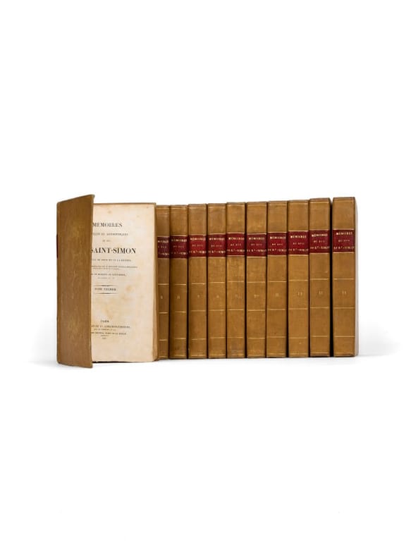 On connaît l'histoire éditoriale tourmentée de ce monument de la littérature mémorialiste française : - Premiers fragments publiés dès 1788-1789 par Soulavie, dans une version fortement altérée ; - Nouvelle sélection en 1818, expurgée de ses passages les plus critiques ; - Ce n'est qu'en 1829, sous l'impulsion de l'éditeur A. Sautelet, qu'apparaît cette édition intégrale, soigneusement établie d'après le manuscrit autographe conservé par la famille de Saint-Simon. Les 21 volumes paraissent en deux années à peine. Ces Mémoires couvrent les années 1691 à 1723 et plongent au coeur de la Cour de Versailles, de la fin du règne de Louis XIV à la Régence; où le duc décrit les personnages de son temps, le fonctionnement de la monarchie absolue, les intrigues, les petitesses et les grandeurs de la vie politique et aristocratique française. Cette édition de Sautelet qui fit découvrir Saint-Simon aux lecteurs du XIXe siècle : Victor Hugo en dira que Saint-Simon écrivait « à coups de canon » et Balzac le lisait comme une bible : on ne compte plus les écrivains, historiens, sociologues et moralistes qui ont vu dans ce texte l'un des sommets de l'intelligence politique. Elle sera réimprimée cinq fois avant la grande édition critique de Chéruel en 1856, enrichie d'une biographie par Sainte-Beuve. Rousseurs éparses sinon bon exemplaire. Tchemerzine, V, p. 660 : «véritable édition originale» ; Carteret, II, p. 284 ; Vicaire, VII, 101-102 ; Legay, 108 ; Guery Alain. Saint-Simon et Montesquieu, in Cahiers Saint Simon, n°27, 1999, p. 17-28.
