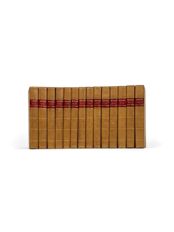 Première édition complète de ce sommet de l'intelligence politique Paris, A. Sautelet et Cie, 1829-1830. 21 vol. (130 x 215 mm). Cartonnage bradel havane, dos lisse ornés de filets dorés, pièce de titre de chagrin rouge, tomaisons (reliure de l'époque). Première édition complète, établie sur la première fois sur le manuscrit complet.