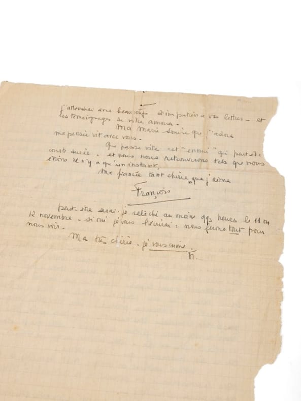 Catherine Langeais (1923-1998), de son vrai nom Marie-Louise Terrasse, et François Mitterrand se rencontrent le 28 janvier 1938, lors du bal de l'École normale supérieure. Deux ans plus tard, prisonnier au stalag IXA en Hesse, il décrira cette rencontre à Jacques Biguet, un de ses compagnons de captivité : « Un samedi, j'avais le cafard, je rentre dans ma chambre, je tombe sur un bristol que j'avais oublié sur une table. C'était une invitation au bal de Normal sup. J'y vais. Je vois une blonde qui me tourne le dos. Elle se tourne vers moi. Je suis resté les pieds rivés au sol. Puis je l'ai invitée à danser. J'étais fou d'elle. » La jeune fille blonde est accompagnée de ses parents qui lui ont interdit de donner son nom à ses cavaliers. Mitterrand la prénommera Béatrice, en référence à Béatrice Portinari, la Florentine de La Divine Comédie. Elle lui dit seulement qu'elle est élève du lycée Buffon, en classe de troisième. Dès le lundi, il guette sa sortie du lycée, la suit de loin, découvre qu'elle habite près de la place Denfert-Rochereau. Jusqu'à un premier baiser au jardin du Luxembourg. François Mitterrand est réellement conquis, comme jamais auparavant dans une relation. Il a déjà demandé la main de Marie-Louise à ses parents, mais la mère de la jeune fille juge ce mariage prématuré. Marie-Louise n'a pas encore 16 ans et François n'a pas accompli son service militaire. 'Qu'à cela ne tienne !', a-t-il répondu. Étudiant, il aurait pu bénéficier d'un nouveau sursis. Il devancera l'appel, en septembre, par amour. Il aurait pu demander à être affecté à une école d'officiers de réserve en province. « Il choisit le 23e régiment d'infanterie coloniale, toujours par amour. Une décision qu'il paiera cher. Pour l'heure, il peut se féliciter de ne pas s'éloigner de Béatrice qu'il appelle aussi « sa petite pêche ». Il est incorporé au fort d'Ivry, puis affecté à la caserne de Lourcine, boulevard du Port-Royal, à Paris » (in Robert Schneider, Les Mitterrand). Le 4 novembre 1938, il voit Marie-Louise, déjeune avec son père et Robert, puis rejoint le fort d'Ivry. Il lui écrit aussitôt - c'est la toute première lettre qu'il rédige depuis son incorporation - « sur un papier aimablement prêté par un de mes nouveaux collèges (déjà en veine de confessions)... Je suis encore dans l'atmosphère de votre présence. Tout à l'heure je vous tenais contre moi, et je pouvais vous dire mon amour [...] maintenant je sens la peine de vous savoir loin [...] inutiles de revenir sur vos promesses : elles valent pour toute la vie. J'attendrai avec impatience vos lettres - et les témoignages de votre amour [...] Peut-être serai-je relâché au moins quelques heures le 11 ou le 12 novembre. Si oui je vous écrirai : nous ferons tout pour nous voir. Ma très chérie, je vous aime. F. » En septembre 1939, c'est la mobilisation, puis le départ à l'ouest de la ligne Maginot. C'est lors d'une permission que les fiançailles auront lieu, le 3 mars 1940, chez les Terrasse, à Paris. Puis, à nouveau, le front. Le 14 juin, après de terribles combats pour lesquels il sera décoré, un éclat d'obus le blesse à Verdun. Évacué vers un hôpital militaire, il est capturé par les Allemands puis envoyé dans un camp de prisonniers. Voilà François Mitterrand « K.G. », pour Kriegsgefangener, c'est-à-dire prisonnier de guerre, sous le matricule 27716-968 du Stalag IX-A, près de Ziegenhain, en Thuringe. Il s'en évadera - après deux premières tentatives avortées -, en janvier 1942. François Mitterrand écrira plus de 300 lettres à celle qu'il surnommait Zou. Malgré des fiançailles en mars 1940, il ne l'épousera jamais. La guerre, puis la captivité, les éloigneront. Dans la douleur pour Mitterrand ; en juin 1942, il écrit à sa confidente, Marie-Claire Sarrazin : « Est-ce que j'aime encore cette Béatrice aux colombes inquiétantes ? Sûrement. Mais je l'aime parce que je l'ai aimée et il y a là une nuance. Je ne souffre pas et puis aimer hors d'elle. Mais elle ne me sera jamais étrangère et est pour moi désormais l'une de ces 'petites déesses allégoriques' dont parle Proust [...]. La belle route des promenades idéales qui m'attire est encore dure à mon pas - l'amour ne me semble parfait ou plutôt complet que sensible. Et pourtant, là aussi l'amertume est proche. » Quelques manques en bordure du feuillet sans atteinte au texte.