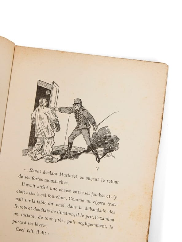 Première édition d'un classique de Courteline, illustré de 41 compositions dans le texte qui fixe d'emblée l'esthétique « caserne » de Courteline. Cette suite de récits féroces et drolatiques sur l'absurde militaire fin-de-siècle - règlements, brimades, petites lâchetés - fit de Courteline l'un des maîtres du genre de la satire française ; son succès entraînera une adaptation scénique, en trois actes, créée à Paris au Théâtre de l'Ambigu-Comique, 18 novembre 1910. Un texte qui sera souvent repris et réillustré au XXᵉ siècle, mais dont le tirage de 1888 demeure la parution princeps. Infimes accrocs ; rare.