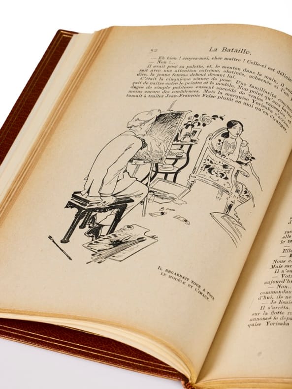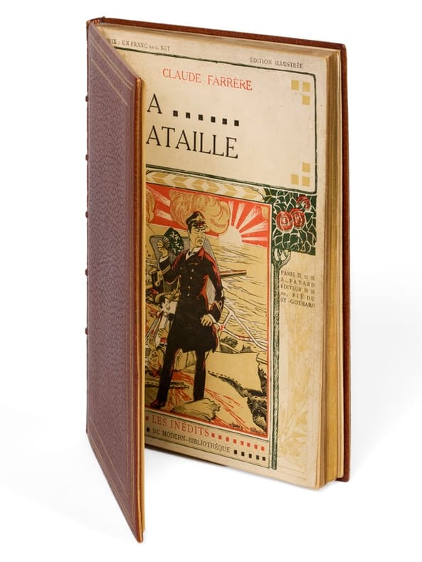Paris, Fayard coll. « Les inédits », (20 février) 1909. 1 vol. (170 x 240 mm) de 187 p. et [2] f. Maroquin havane, dos à nerfs ornés de caissons d'encadrement doré, titre doré, date en pied, triples filets dorés d'encadrement sur les plats, tranches dorées, doubles filets dorés sur les coupes, contreplats à encadrement, couvertures et dos conservés (Reliure signée d'Ersè). Édition originale. Premier tirage des illustrations qui l'accompagnent : 12 figures hors texte et nombreuses compositions dans le texte d’après Charles Pourriol. Envoi signé : « Pour Monsieur Sterlet, en cordial souvenir, Claude Farrère ». On connaît une autre dédicace de Farrère au même, dans l'édition originale des Civilisés.