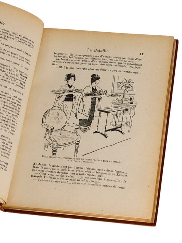 Écrit en 1909 - soit quatre ans après la guerre russo-japonaise -, La Bataille a connu un succès considérable, à tel point tel que Guerlain emprunta le nom de l'héroïne principale pour son parfum « Mitsouko ». La bataille en question est celle de Tsou-Shima qui vit l'escadre japonaise de l'amiral Togo détruire en quelques heures la flotte Russe de l'amiral Rojestvenski. Bel exemplaire, bien établi.
