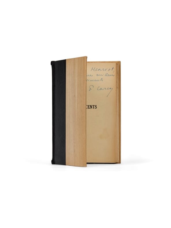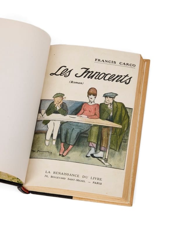 Envoi et note autographe Paris, La Renaissance du Livre, 1916. 1 vol. (115 x 185 mm) de 265 p. et [1] f. Demi-chagrin noir, dos orné de deux faux nerfs, titre doré, tête dorée, couvertures illustrées conservées. Édition originale. Envoi signé : «à Émile Henriot, avec mes meilleurs sentiments. F. Carco». Le chapitre XXIV a été censuré ainsi que la dernière ligne de la page 184 : notre exemplaire comporte un ajout manuscrit de l'auteur à cet endroit.