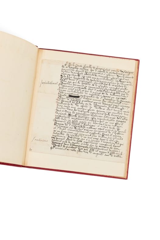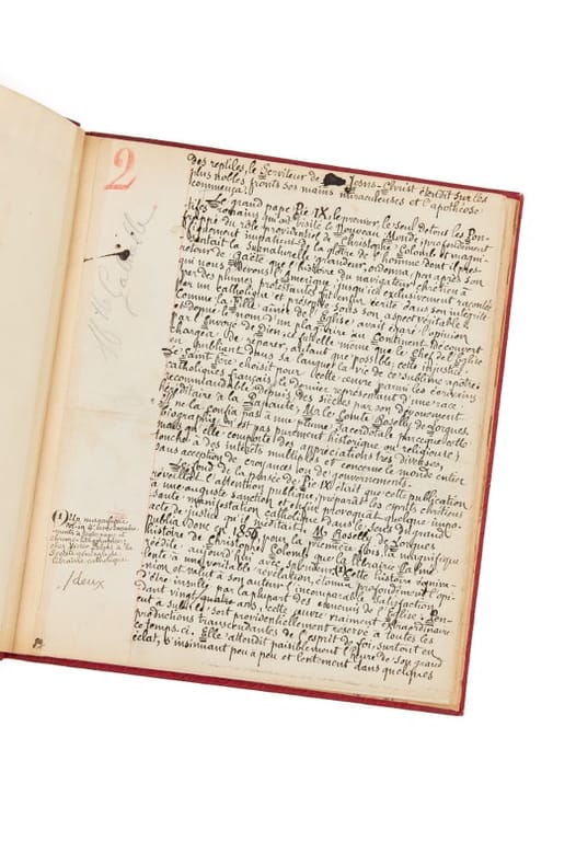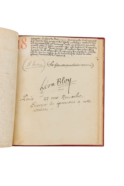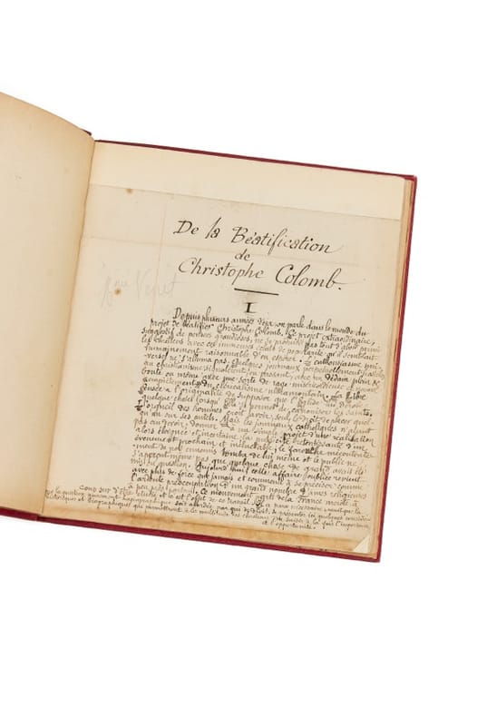 Manuscrit autographe complet [Paris, 1879]. 1 vol. (180 x 215 mm) de 32 pages montées sur onglets. Bradel percaline rouge gaufrée, pièce de titre en long. Manuscrit autographe complet du premier des articles de Bloy consacrés à Christophe Colomb paru dans la Revue du monde catholique (n° 11 et 12) des 15 et 30 mars 1879 – qui fera partie du futur Révélateur du globe.