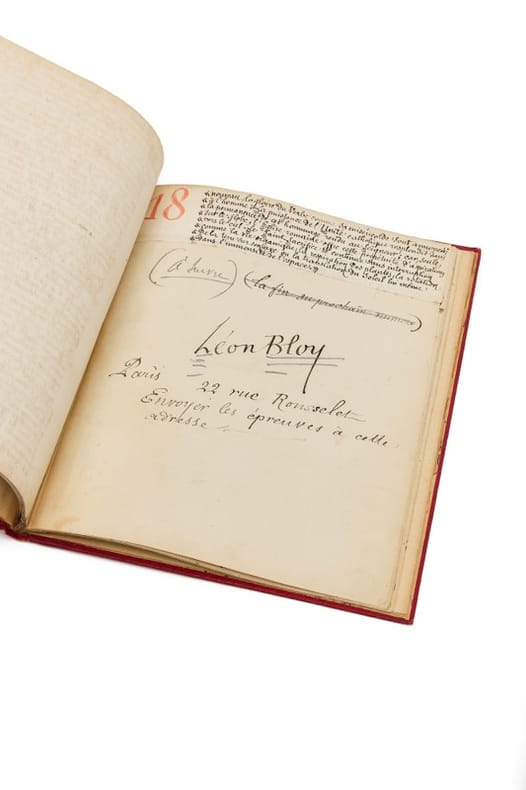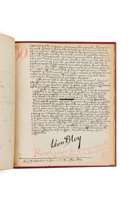 D’une écriture large et lisible comme Léon Bloy s’y appliquait pour les manuscrits qu’il confiait à la dactylographie, le cahier est rédigé à l’encre brune sur papier d’écolier ligné sur lequel il a tracé une marge au crayon de couleur rouge. Son texte est réglé en colonne de 135 mm, justifié à gauche. Les pages sont numérotées en gros caractères et au crayon de couleur rouge dans la marge supérieure gauche de 2 à 30 ainsi qu’à l’encre en marge inférieure gauche, mais d’une numérotation irrégulière. Toujours dans la marge gauche, Bloy a porté des corrections et des ajouts. Au feuillet 18 se termine la première partie du texte et Bloy a biffé « La fin au prochain numéro », et ajouté « Léon Bloy / Paris 22 rue Rousselet. Envoyer les épreuves à cette adresse ». La même mention se répète à la fin du manuscrit au feuillet 30. Le manuscrit est signé à deux reprises « Léon Bloy ». En marge gauche, d’une autre main, on repère les noms des dactylos (12 en tout). Composition des 7 chapitres du manuscrit : « De la béatification de Christophe Colomb » : - [f. 1 à 5] page 2 à 4 : ch. I ; - [f. 5 à 10] page 4 à 9 : ch. II ; - [f. 10 à 14] page 9 à 13 : ch. III ; - [f. 14 à 19] page 13 à 18 : ch. IV (fin de la première livraison et signature de Bloy). « De la béatification de Christophe Colomb - Suite et fin » : - [f. 20 à 23] page 19 à 22 : ch. V ; - [f. 23 à 29] page 22 à 28 : ch. VI ; - [f. 30 à 31] page 28 à 30 : ch. VII. Après la lecture de La vie de Christophe Colomb par le comte Roselly de Lorgues et des multiples ouvrages que ce dernier lui avait consacré, Bloy n'aura de cesse de soutenir la cause du découvreur de l'Amérique auprès de l'Église dont il attendait que s'ouvre une enquête destinée à sa béatification. Il donnera ainsi à la Revue du Monde catholique trois articles, dont notre manuscrit : « De la Béatification de Christophe Colomb » et « Obstacles à l'Introduction de la Cause » le 15 juillet 1879. Ces articles prendront place dans le futur livre que Bloy fera paraître chez Sauton en 1884 : Le Révélateur du globe. Après la parution, il relancera ce qui lui tient tant à coeur et adressera - en latin - une lettre à l'épiscopat français : il en reste aujourd'hui une rare petite plaquette dont le tirage est entièrement hors commerce : Lettre encyclique à tous les évêques de France (Paris, s.é., 4 octobre 1890). Des bibliothèques William Froehlich (ex-libris) ; Daniel Sickles (XI, n° 4190).