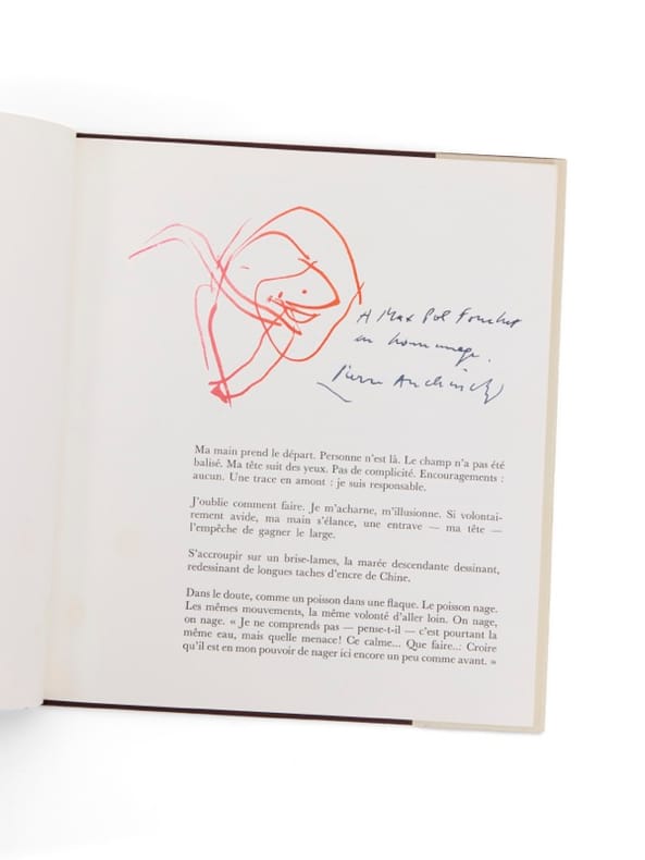 Envoi signé à Max-Pol Fouchet Paris, Denoël, (mai) 1966. 1 vol. (230 x 260 mm) de 84 p. Cartonnage, jaquette et étui illustrés de l'éditeur. Édition originale. Tirage unique à 3 000 exemplaires. Un des exemplaires poinçonnés du service de presse. Envoi signé : « À Max-Pol Fouchet, en hommage. Pierre Alechinsky ».