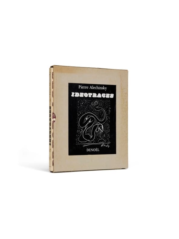 Idéotraces, publié au printemps 1966 chez Denoël, marque une étape importante dans la carrière de Pierre Alechinsky, figure centrale du mouvement CoBrA, alors âgé de 39 ans. Le livre propose un manifeste visuel et calligraphique, où se croisent gravures, encres, impressions, gestes et textes : « cette équivoque entre écriture et peinture, Alechinsky l'assume entièrement, et en fait presque un système. Il a dû lui arriver plus d'une fois de commencer un poème et d'aboutir à un tableau, ou l'inverse. En définitive, Pierre Alechinsky s'est constamment moqué des écoles, et si sa peinture était hier un peu moins figurative, aujourd'hui un peu plus, c'est qu'on n'échappe pas totalement aux suggestions de son époque» (Conil Lacoste, Le Monde, 9 décembre 1966). L'ouvrage fut publié à l'occasion d'une exposition de l'artiste à la Galerie de France, où ses oeuvres furent présentées jusqu'en janvier 1967.