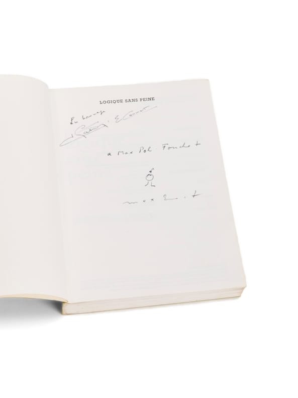 Envoi et dessin de Max Ernst.Exemplaire Max-Pol Fouchet. Paris, Hermann, 1966. 1 vol. (140 x 185 mm) de 288 p. et [2] f. Broché, sous couverture illustrée. Édition originale de la traduction par Jean Gattegno et Ernest Coumet. Illustrations de Max Ernst. Envoi signés des traducteurs. Envoi signé accompagné d'un petit dessin : « À Max-Pol Fouchet, Max Ernst ».