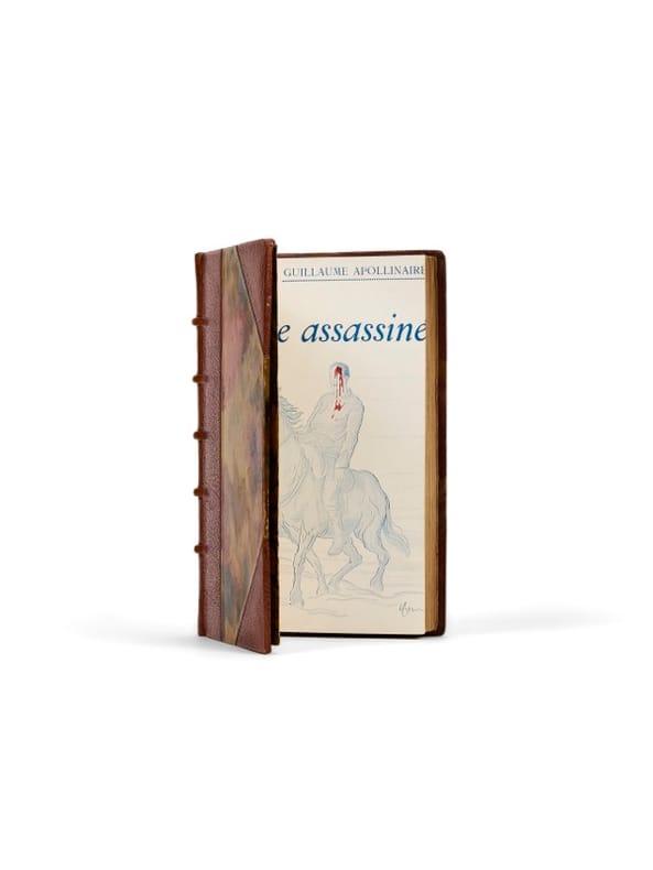 Édition originale. Cet ouvrage, dont il n'existe pas de grands papiers, comprend seize contes publiés pendant la convalescence du poète. Il est illustré d'un portrait-frontispice d'Apollinaire par André Rouveyre et d'une couverture en couleurs par Capiello représentant un cavalier blessé à la tête. De la bibliothèque d'André Saglio. Exemplaire enrichi d'un émouvant envoi autographe d'Apollinaire alors en convalescence à l'hôpital militaire : "À monsieur Saglio. Souvenir très cordial de Guillaume Apollinaire. Sous-lieutenant en traitement à l'Hôpital du gouvernement italien 41 quai d'Orsay". Peintre, décorateur et costumier français, André Saglio (Versailles, 1869-Paris, 1929) fut commissaire du gouvernement français pour les expositions des Beaux-Arts de 1890 à 1921. Il créa les décors et les costumes de nombreux spectacles au théâtre des Arts de 1910 à sa mort. Au début de la guerre, en septembre 1914, il se fit infirmier puis s’engagea en tant que volontaire dans l’artillerie comme canonnier de 2e classe. Envoyé au front, il y restera jusqu’en août 1916. Le 16 juillet, il fut nommé sous-lieutenant à la bataille de Verdun. Exténué, malade, il ne retourna pas au front. Guillaume Apollinaire s'engagea lui aussi dans l'Armée française en 1914. En novembre 1915, dans le but de devenir officier, il fut transféré à sa demande dans l'infanterie dont les rangs étaient décimés. Il entra au 96e régiment d'infanterie avec le grade de sous-lieutenant. Le 17 mars 1916, il fut blessé à la tempe par un éclat d'obus. Évacué à Château-Thierry puis transféré à Paris, il y fut trépané le 10 mai 1916 et entama une longue convalescence. Fin octobre, son recueil de contes Le Poète Assassiné fut publié. L'Hôpital du gouvernement italien pour les blessés de Guerre Français fut un des hôpitaux complémentaires de l’hôpital militaire du Val-de-Grâce. Il fut fondé à l’entrée de l'Italie en guerre aux côtés des Alliés par l'épouse de l'ambassadeur d'Italie en France, Donna Bice Tittoni. Très bon exemplaire en reliure signée.