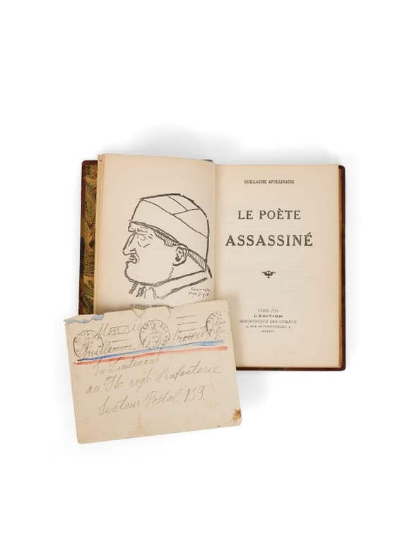 L'enveloppe est imprimée à l'en-tête de « Hotel de Castille 37 rue Cambon à Paris » : à cette date, deux personnalités proches d'Apollinaire y résident : Natalia Gontcharova et Mikhaïl Larionov, pour qui le poète avait donné, en 1914, la préface pour le catalogue de l'ouverture de la galerie Paul Guillaume, qui présentait les oeuvres des deux artistes. En mars, il écrit à leur sujet à Max Jacob : " MM. GONTCHAROVALARIONOF [sic] sont je crois toujours hôtel de Castille, rue Cambon, je leur ai envoyé un poème qu'ils voulaient publier à Paris [...] mais je crains qu'ils le publient en Russie sans le publier ici [...] si tu avais du temps tu irais le copier et me ferais plaisir " (lettre à Max Jacob, 14 mars 1916, collection R.B.L., 22 mai 2019, n° 9). Sous-lieutenant d'infanterie depuis le 18 novembre 1915, Apollinaire regagne Paris début janvier, après sa rupture avec Louise de Coligny-Châtillon, à qui il écrit pour la dernière fois le 18 janvier 1916. Son régiment entre en repos en janvier et février et Apollinaire a alors quelque loisir pour écrire et terminer les nouvelles d'un futur recuei de nouvelles, le deuxième après L'Hérésiarque et Cie (publié en 1910) : un ensemble de textes écrits entre 1900 et 1913, mais qu'il est en train, comme l'attestent les manuscrits, de considérablement remanier. Il retire cinq contes et en ajoute un dernier, le « Cas du brigadier masqué c'est-à-dire le poète ressuscité ». Début février, il peut écrire à son éditeur P.V. Stock qu'il a « l''intention de faire paraître un volume de nouvelles si je trouve un éditeur. Je l'intitulerai le poète assassiné (...)", et pour lequel il souhaite contacter les frères Briffaut, fondateurs de la maison d'édition Bibliothèque des Curieux. Apollinaire leur confiera l'édition de son recueil, en octobre. Il repart sur le front début mars, après une ultime permission à Oran chez Madelaine Pagès, avant de monter en ligne avec son unité à quelques kilomètres de Berry-au-Bac. mars : blessé le 17 mars par un éclat d'obus qui l'atteint à la tempe droite, il est transféré à l'hôpital italien du Quai d'Orsay, il est trépané le 9 mai et reçoit la Croix de guerre le 17 juin. Le recueil sera livré en librairie en novembre, avec, en frontispice, un portrait du « sous-lieutenant Guillaume Apollinaire » par André Rouveyre, répondant au dessin de couverture de Leonetto Cappiello : une illustration en couleurs montrant un cavalier au front sanguinolant. Le 9 novembre 1918, presque deux ans jours pour jours après la parution de ce livre, le poète mourrait de la grippe espagnole dans Paris presque libéré. Bon exemplaire, sans rousseurs. Reliure modeste ; couverture légèrement rognée en marge.