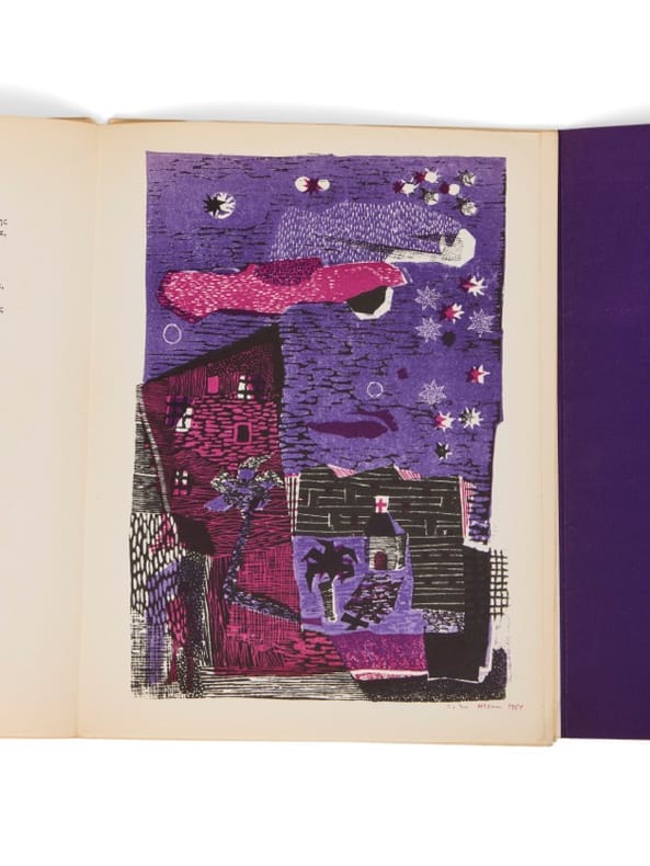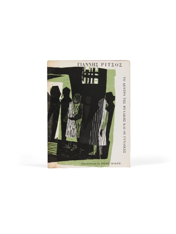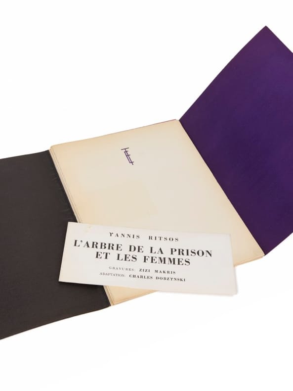 Le témoignage de la prison par Yannis Ritsos Athènes, Éditions Revue d'Art, 1963. 1 vol. (215 x 280 mm) de 7 p. (version française) et 8 p. (version grecque) + 4 gravures. En feuilles, sous couverture illustrée en couleurs. Édition originale bilingue. Adaptation de Charles Dobzynski. Illustrée de 4 gravures de Zizi Makris, dont deux en couleurs, signées. Rare publication, imprimée à petit nombre.