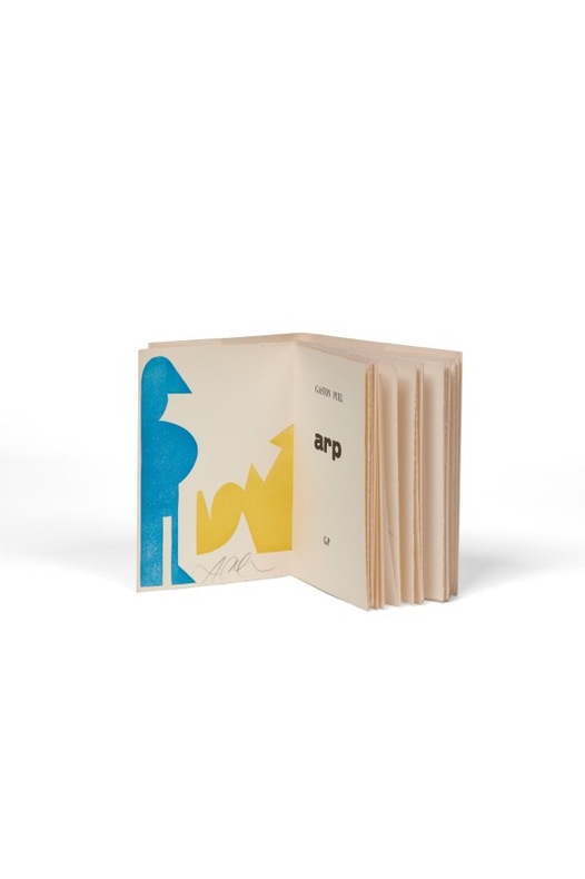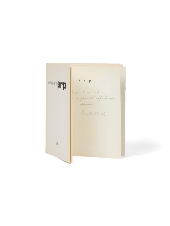 Poète, critique et essayiste, Gaston Puel se lia après-guerre à Joë Bousquet, Tristan Tzara, Hans Bellmer et surtout René Char, avec qui il chemina longtemps avec les artistes que l'un et l'autre affectionnaient. Il dirigera à l'Université de Maryland (USA), en 1971, un séminaire sur le poète. Il avait auparavant crée son atelier d'imprimerie en 1961, en publiant de ravissants livres de peintres, les plus importants avec Miro et Arp. C'est avec ce dernier que Puel publia son recueil de poèmes, Ce chant entre deux astres, à Lyon, en 1959, avec deux illustrations de Arp. Avant, six ans plus tard, de lui consacrer cet ouvrage que son ami illustrera de quatre linogravures originales. Très bel exemplaire, de belle provenance.