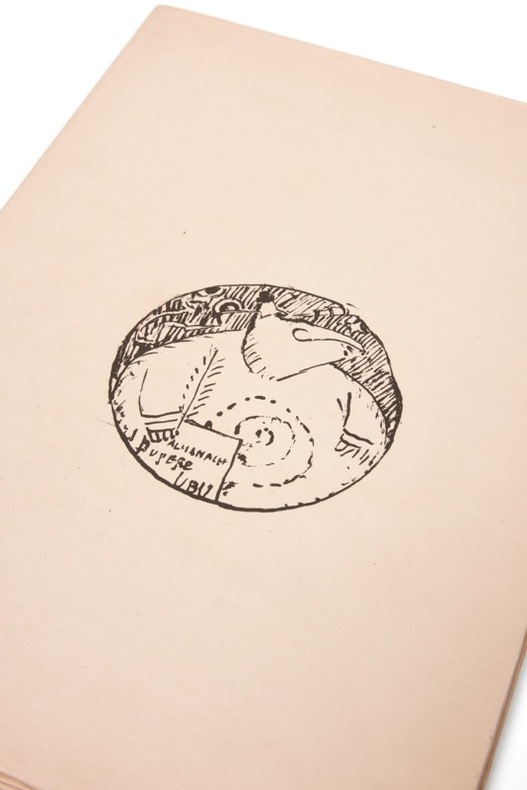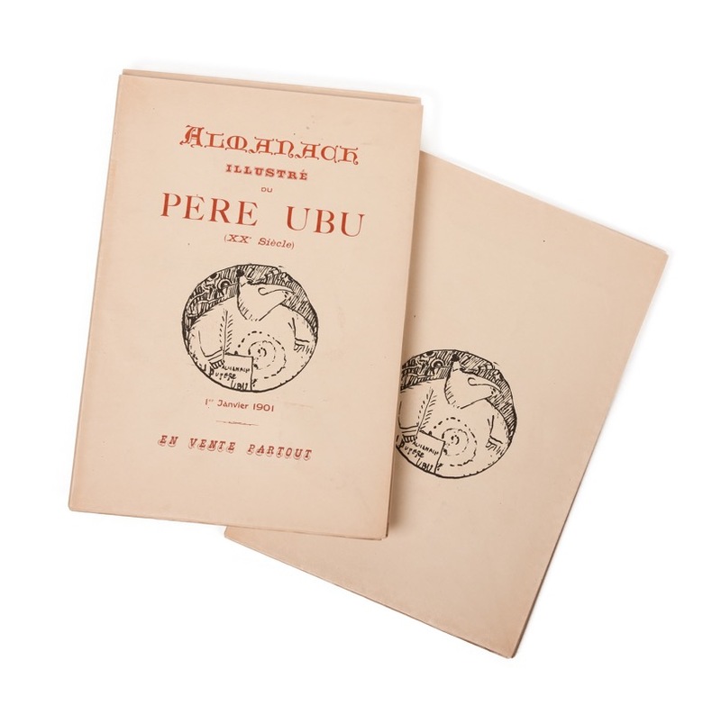Ubu roi illustré sur japon [Paris, A. Vollard, 1er janvier 1901]. 2 vol. (205 x 285 mm) de 56 p. puis 28 f. (pour la suite). En feuilles. Édition originale. Elle est illustrée de 83 exquises lithographies imprimées en bistre, bleu et noir (pour la couverture) de Pierre Bonnard. Un des 25 premiers exemplaires sur japon, sous couverture spéciale et la suite en noir des 83 lithographies.